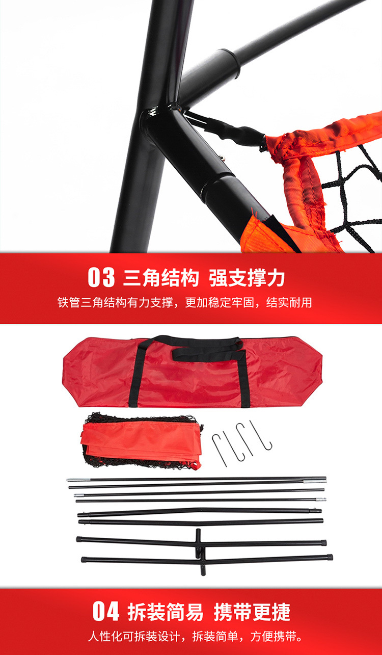 ▸滌綸網身,品質優良,遇水自動滲透到草坪下面,不用擔心積水問題。▸無結網身,由專業設備編織,網孔均勻美觀,大小一致。▸鐵管三角結構有力支撐,更加穩定牢固,結實耐用。▸人性化可拆裝設計,拆裝簡單,攜帶更是方便。