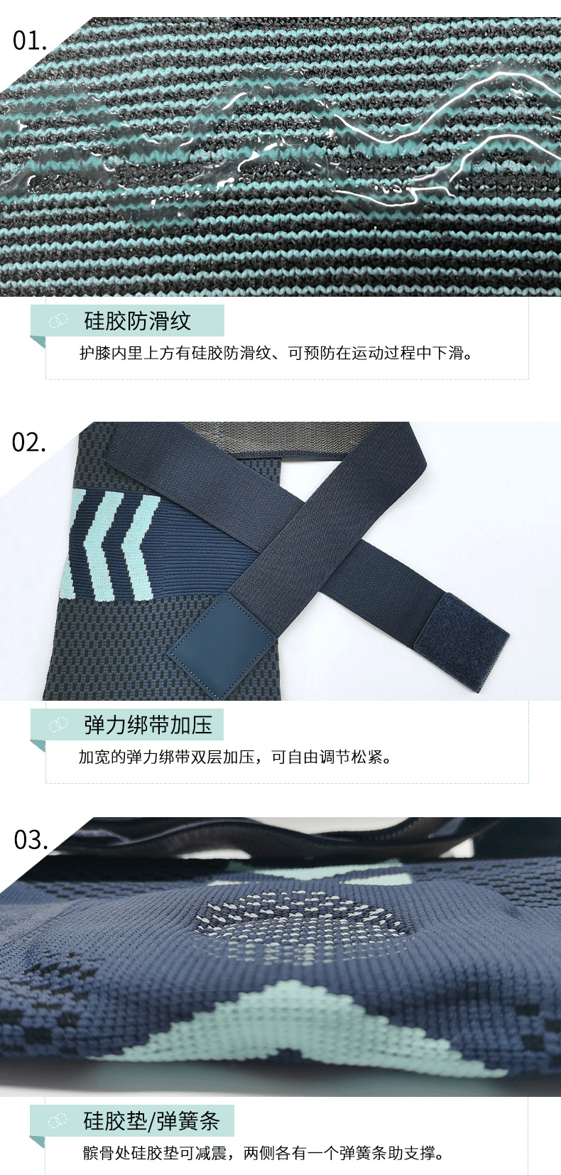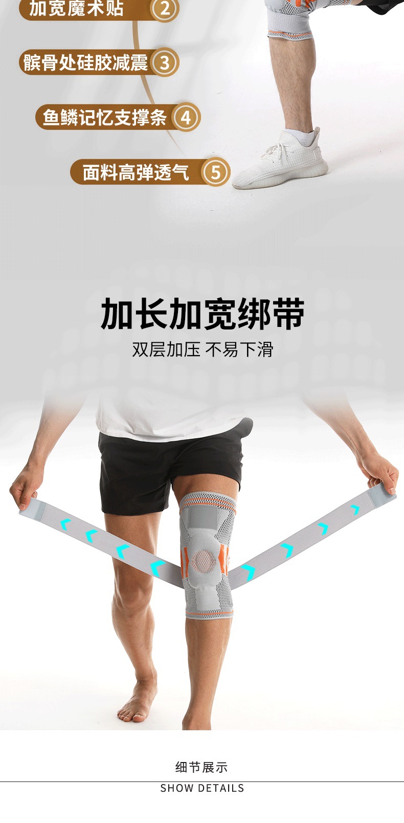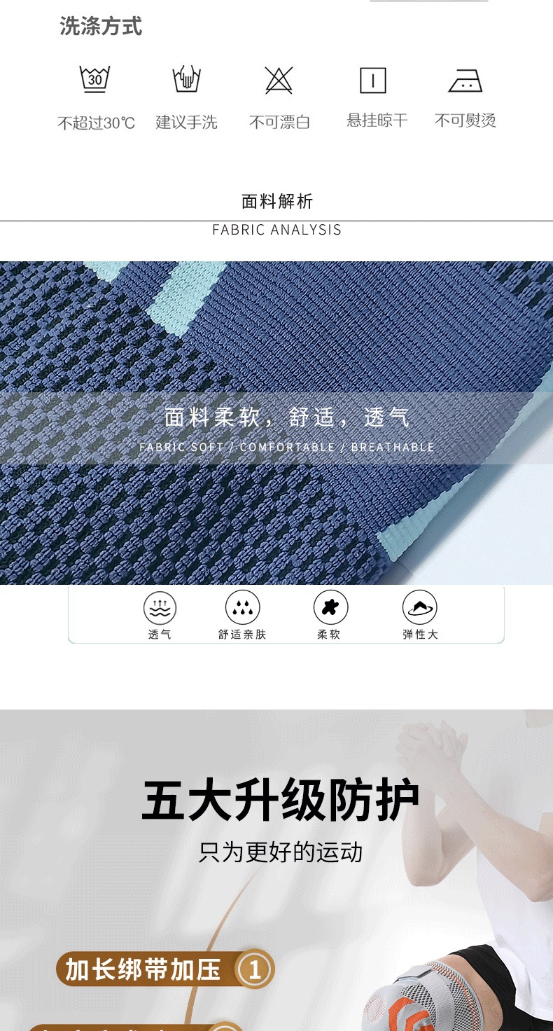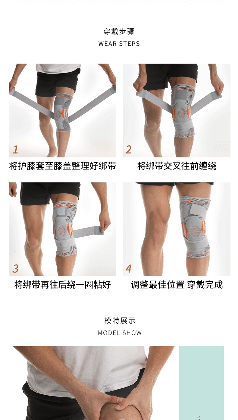 ▸髕骨處硅膠墊可減震,兩側各有一個彈簧條助支撐。
