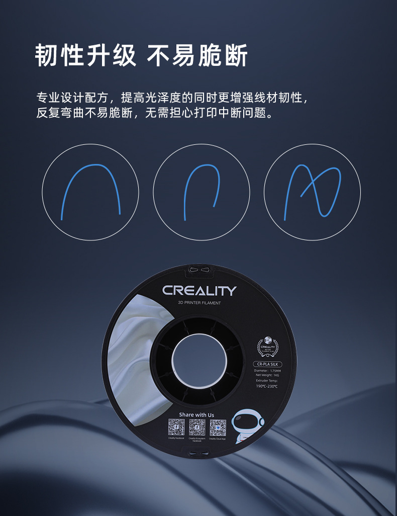 ▸專業設計配方,提高光澤度的同時增強線材韌性,反復彎曲也不易折斷,無須擔心打印中斷。