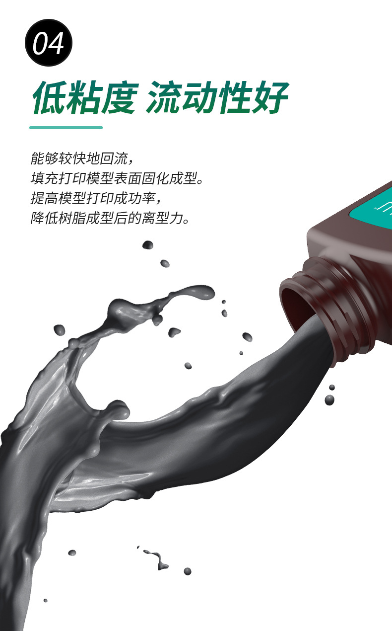 ▸能夠較快地回流,填充打印模型表面固化成型,提高打印成功率,降低樹脂成型後的離型力。
