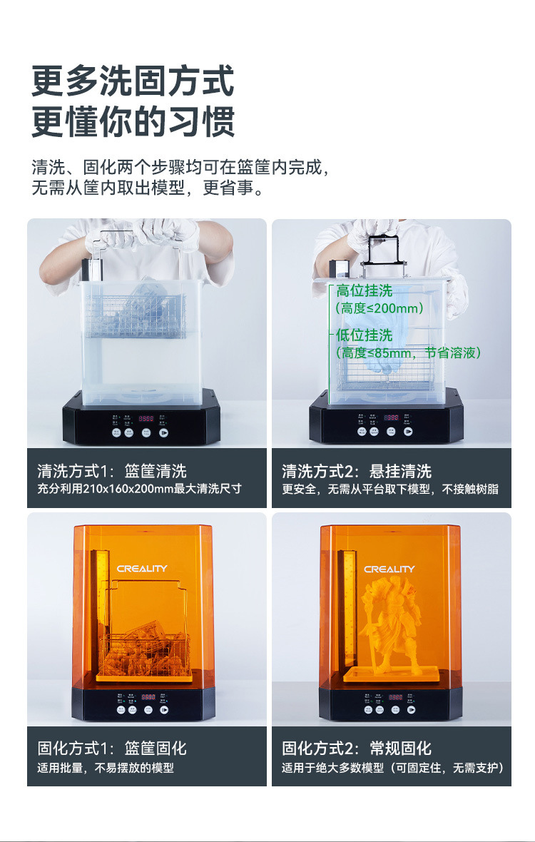▸清洗和固化均有兩個檔位,支持定時設置;採用反饋感強的物理按鍵方式,操控響應流暢。