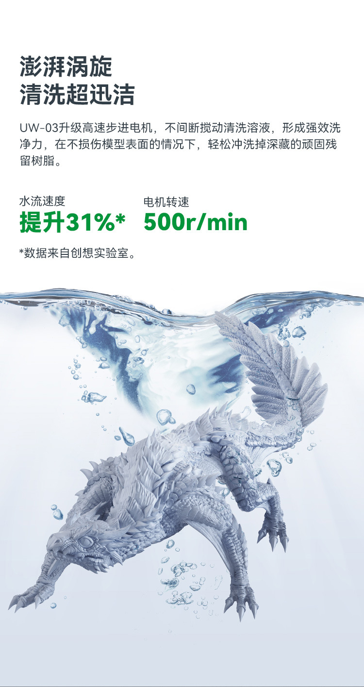 ▸升級高速步進電機,不間斷攪動清洗溶液,形成強效洗淨力,在不損傷模型表面的情況下,輕鬆沖洗掉頑固殘留樹脂。