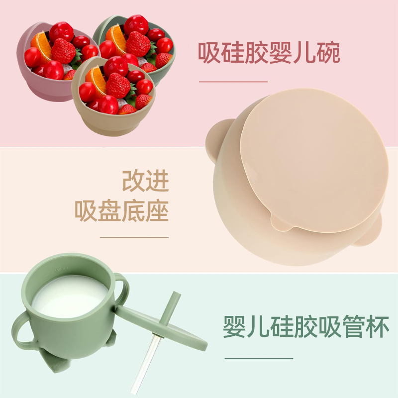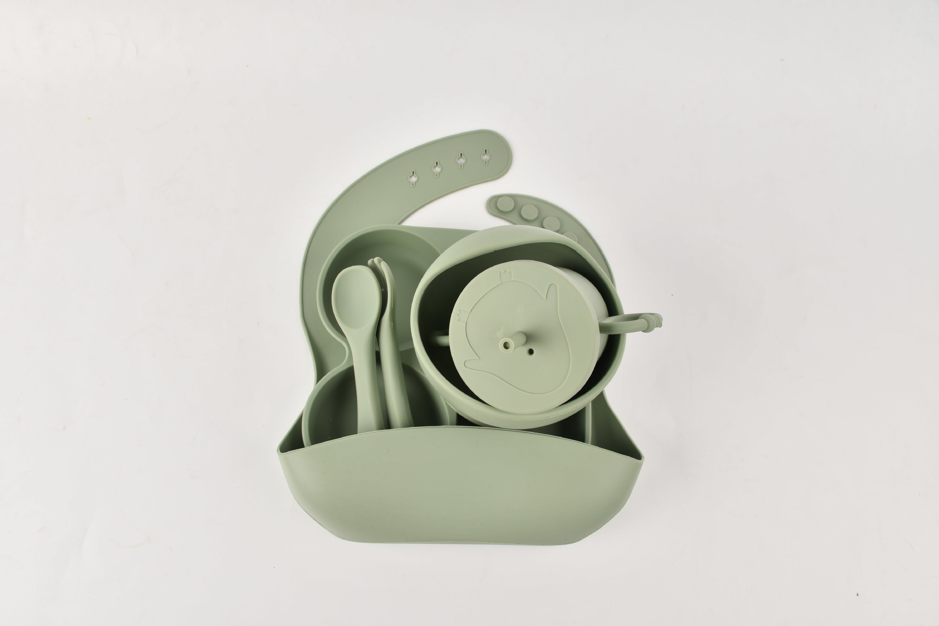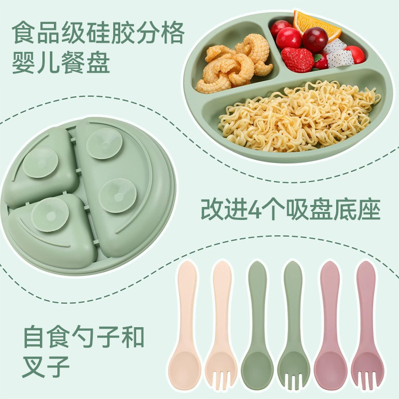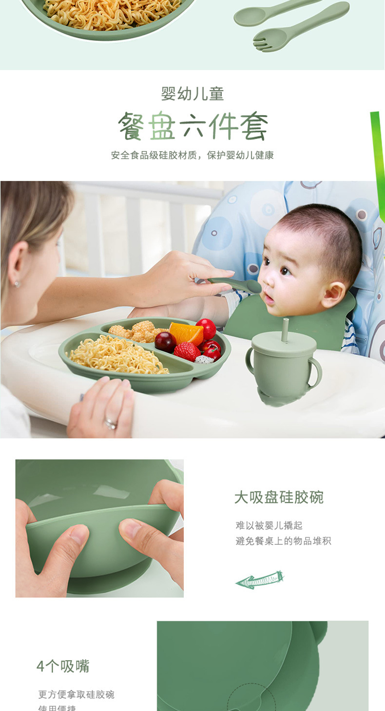 • 硅膠輔食餐盤六件套兒童寶寶輔食碗勺子杯子茶籽圍兜餐具套裝
