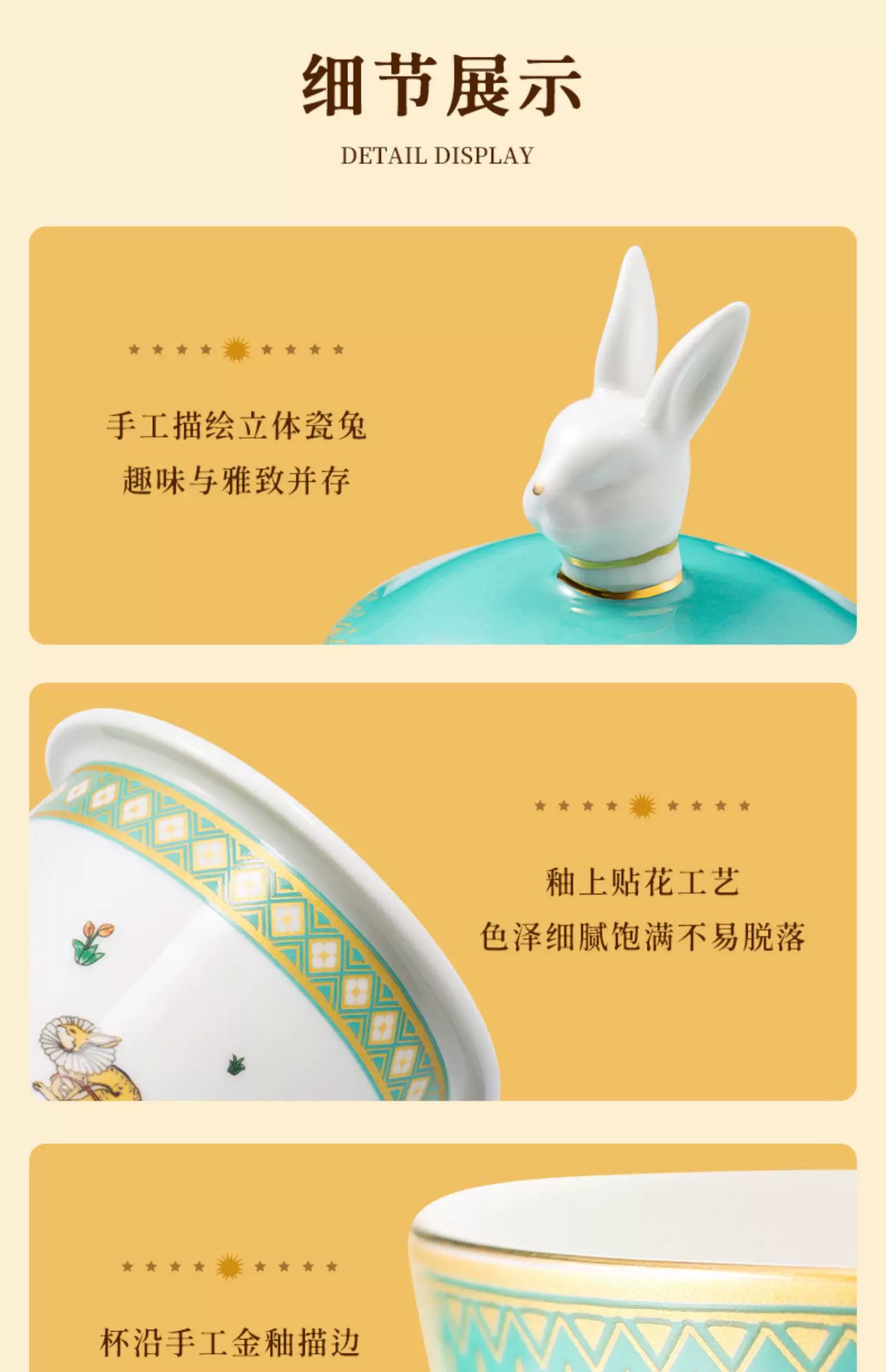 獨特的兔子蓋兼具實用性,邊緣的創意凹槽可以牢固地固定您的茶匙。專利的纖腰杯身舒適地貼合您的手,而雙藤手柄為您的茶道增添了一絲優雅和高貴。這款骨瓷杯由天然礦物骨灰製成,不含鉛和鎘,確保安全愉快的飲茶體驗。