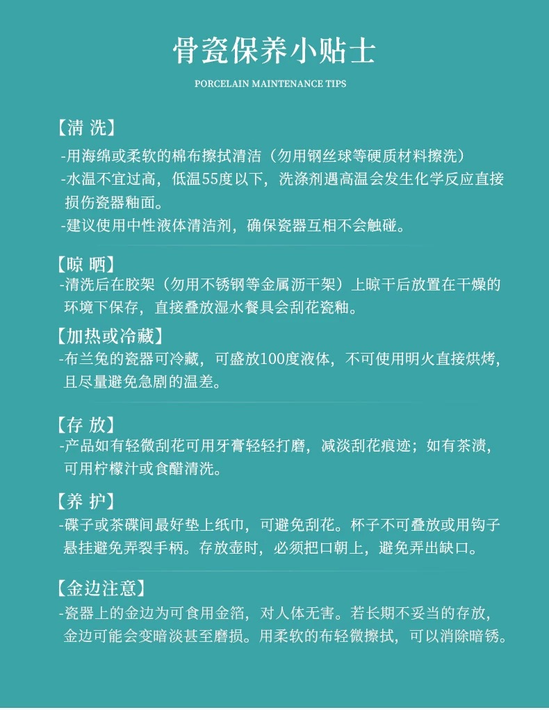 清洗:用海綿或柔軟的棉布擦拭清潔(勿用鋼絲球等硬質材料擦洗)。水溫不宜過高,低溫55度以下,洗滌劑遇高溫會發生化學反應直接損傷瓷器釉面。建議使用中性液體清潔劑,確保瓷器互相不會觸碰。