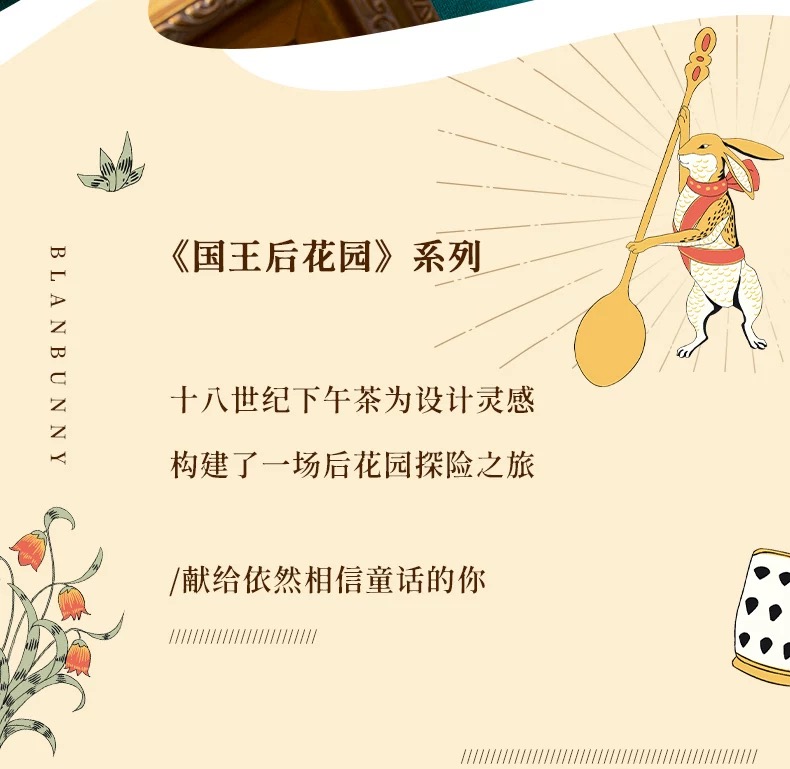 為了探索茶的神秘力量,布蘭兔先生和他的朋友們冒險進入了女王的花園,這讓皇家衛隊非常不安。於是,一場神奇的茶會開始了。我們提供四種鮮豔的顏色,希望每一口都能喚醒你對生活的多彩喜悅。