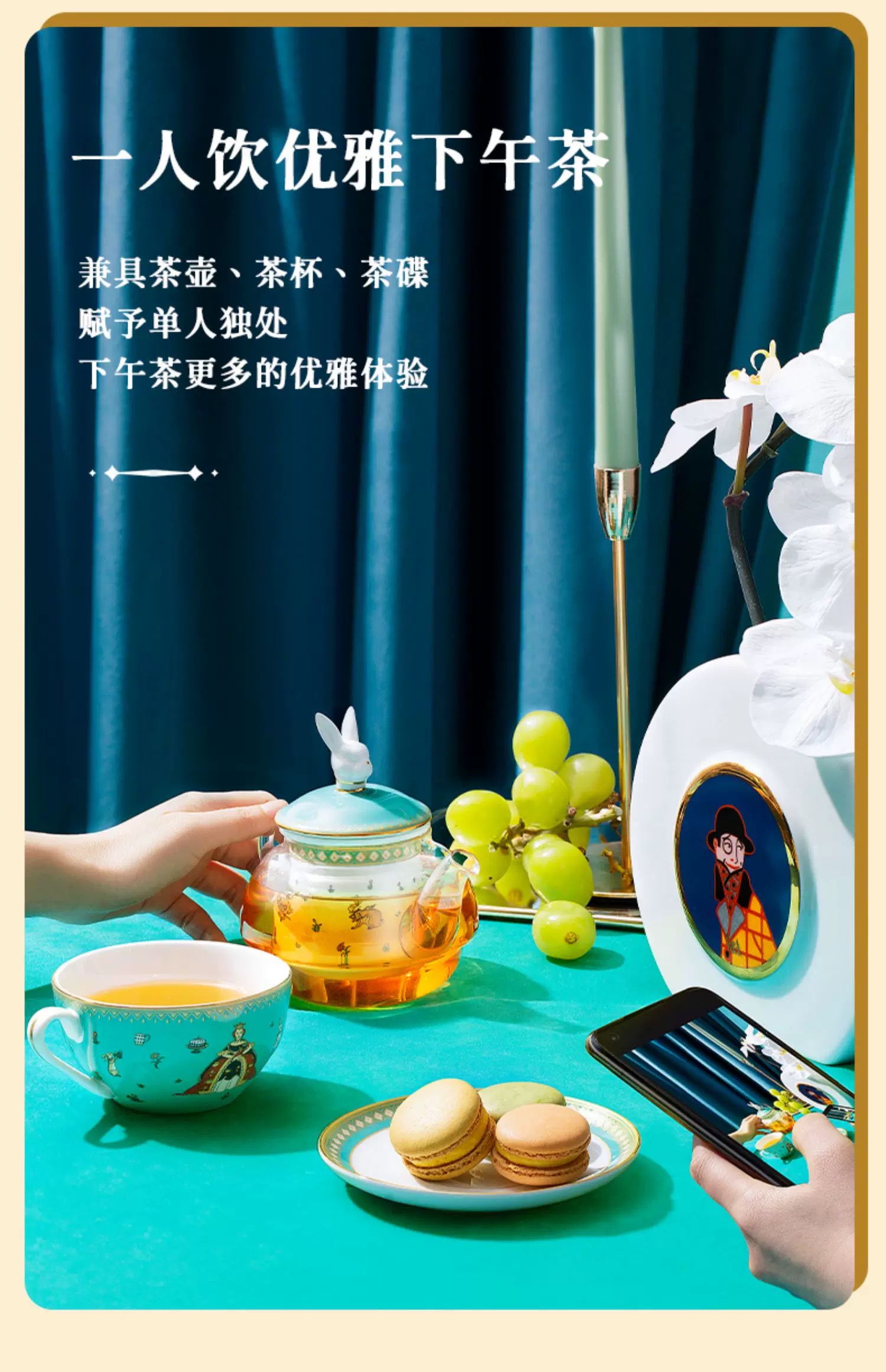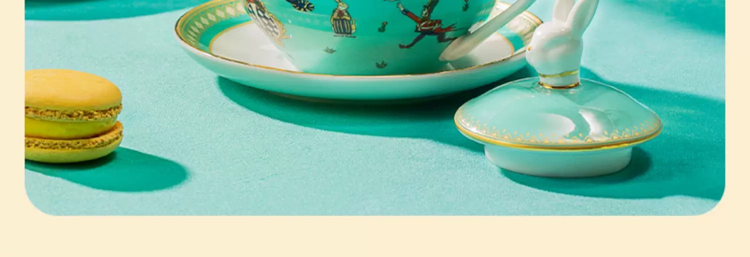 我們的“三月兔音樂盒”是“愛麗絲自我發現之旅”珠寶盒系列的一部分,靈感來自《愛麗絲夢遊仙境》。三月兔手持裝滿木槿花茶的茶壺,優雅地為尊貴的客人們服務。當音樂盒播放時,迷人的旋律為愉快的音樂下午茶奠定了基調,茶與音樂完美融合。