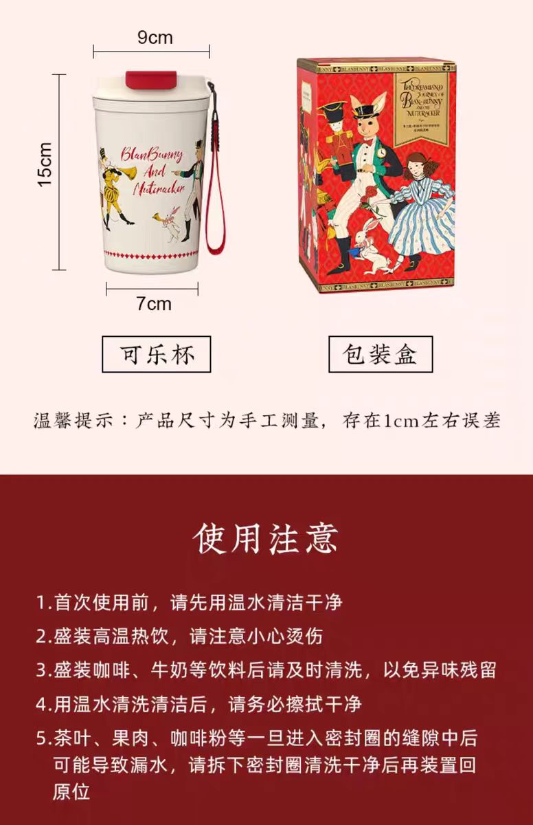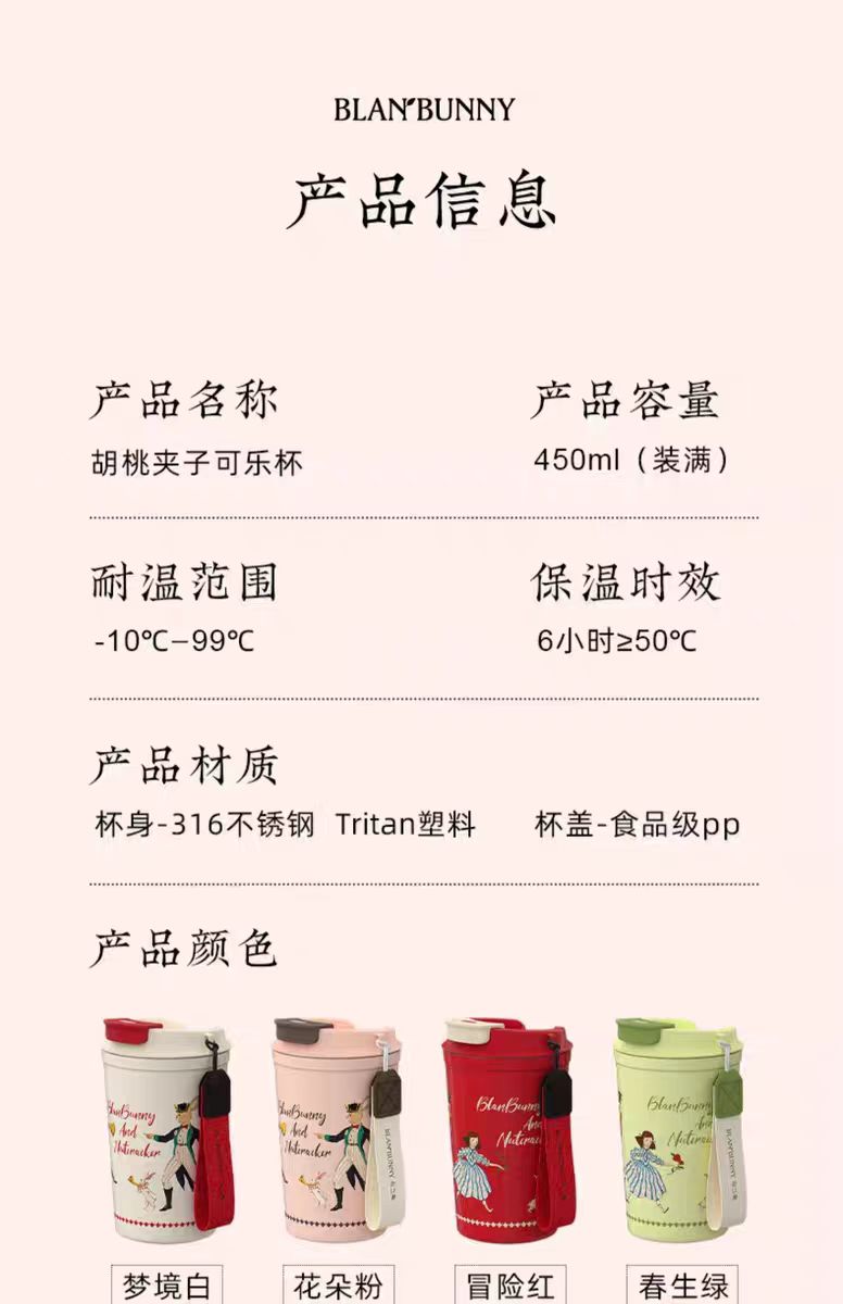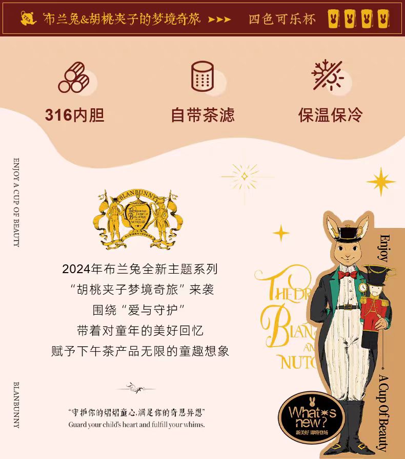 踏上布蘭兔全新2024胡桃夾子夢幻樂園可樂杯的奇妙茶之旅。靈感來自深受喜愛的胡桃夾子故事,這款設計帶來“愛與保護”的感覺,同時喚起童年的回憶。無論是日常茶時間還是外出飲品,這款杯子都為每一口增添了一絲俏皮的魅力。