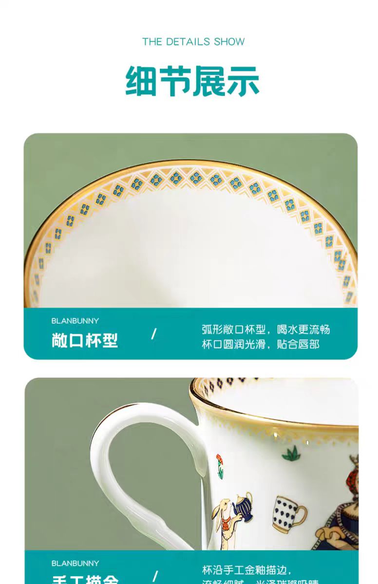 獨特的兔子蓋兼具實用性,邊緣的創意凹槽可以牢固地固定您的茶匙。專利的纖腰杯身舒適地貼合您的手,而雙藤手柄為您的茶道增添了一絲優雅和高貴。這款骨瓷杯由天然礦物骨灰製成,不含鉛和鎘,確保安全愉快的飲茶體驗。