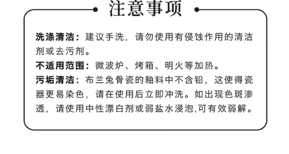 加熱或冷藏:布蘭免的瓷器可冷藏,可盛放100度液體,不可使用明火直接烘烤且盡量避免急劇的溫差。