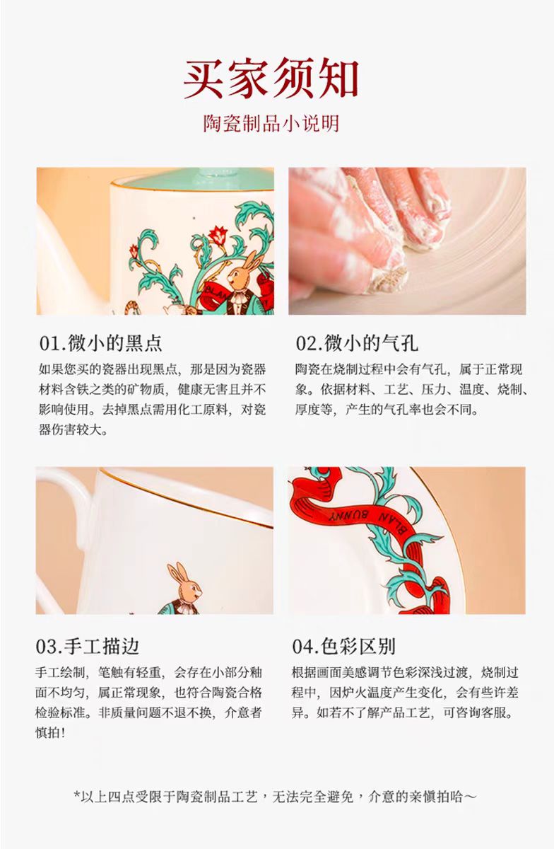 金邊注意:瓷器上的金邊為可食用金箔,對人體無害。若長期不妥當的存放,金邊可能會變暗淡甚至磨損。用柔軟的布輕微擦拭,可以消除暗銹。
