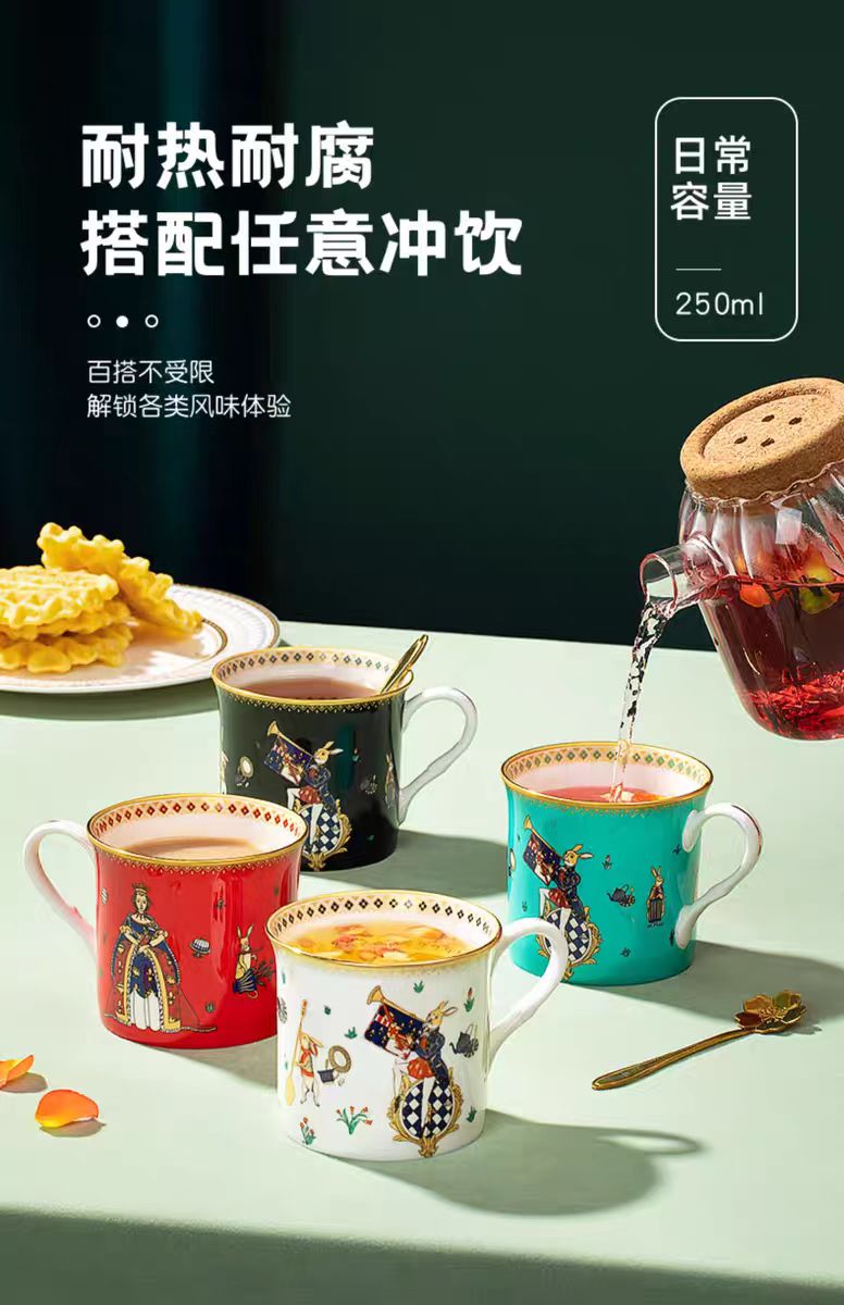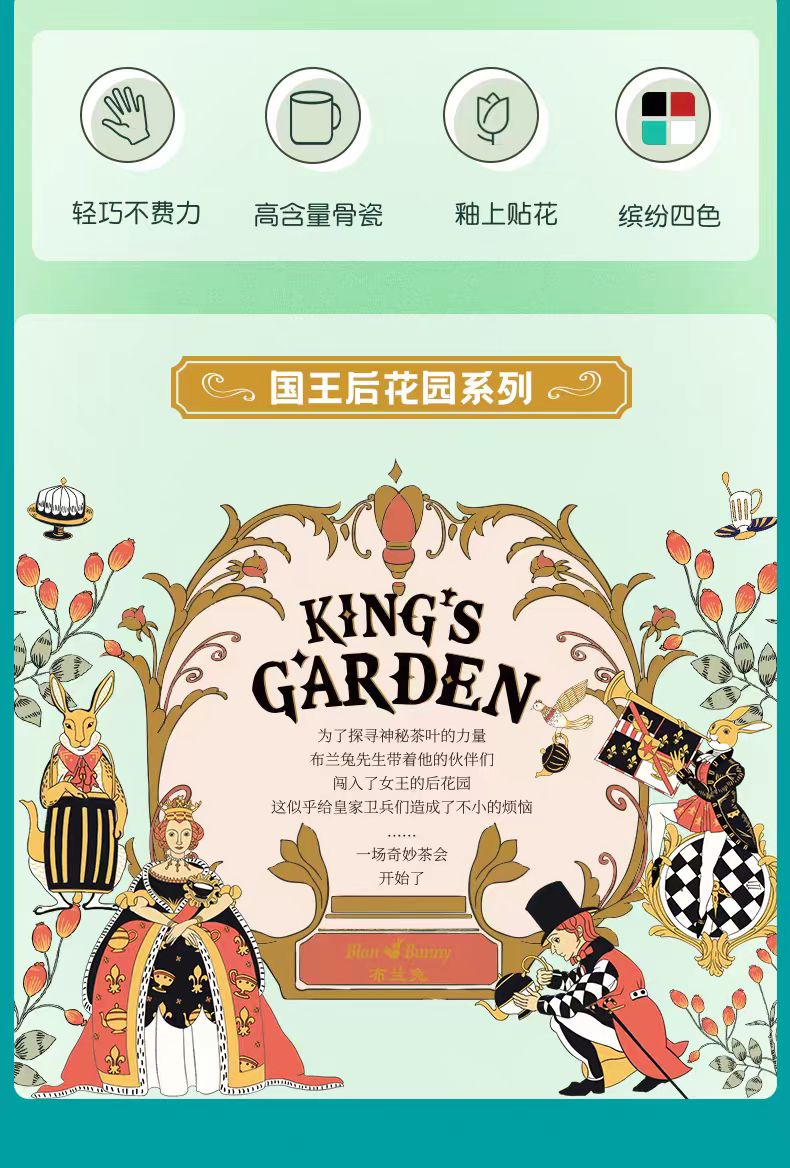 為了探索茶的神秘力量,布蘭兔先生和他的朋友們冒險進入了女王的花園,這讓皇家衛隊非常不安。於是,一場神奇的茶會開始了。我們提供四種鮮豔的顏色,希望每一口都能喚醒你對生活的多彩喜悅。