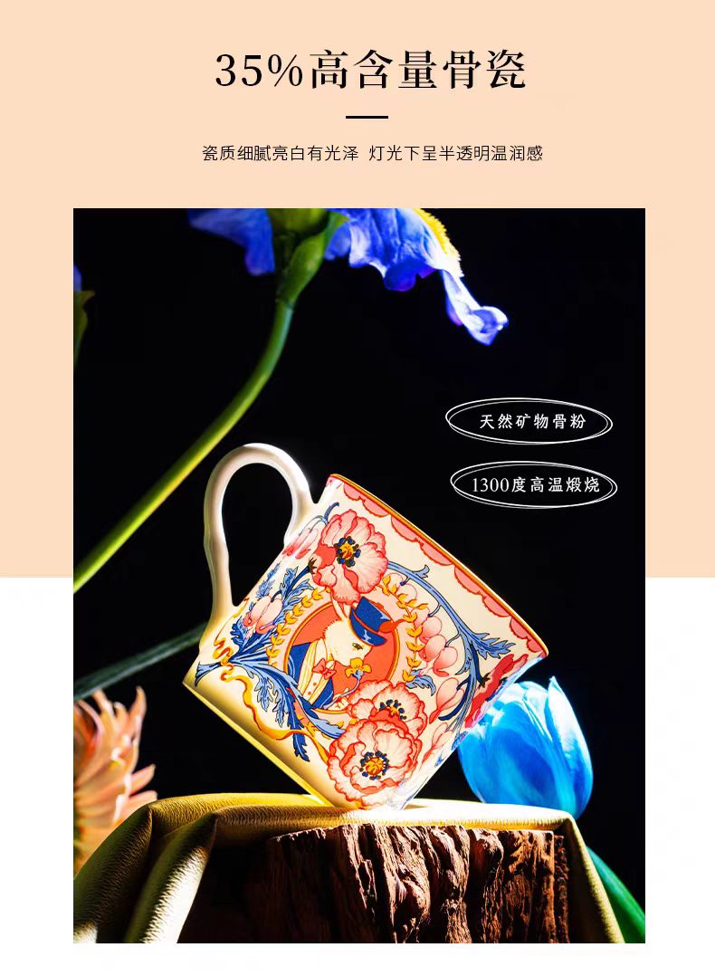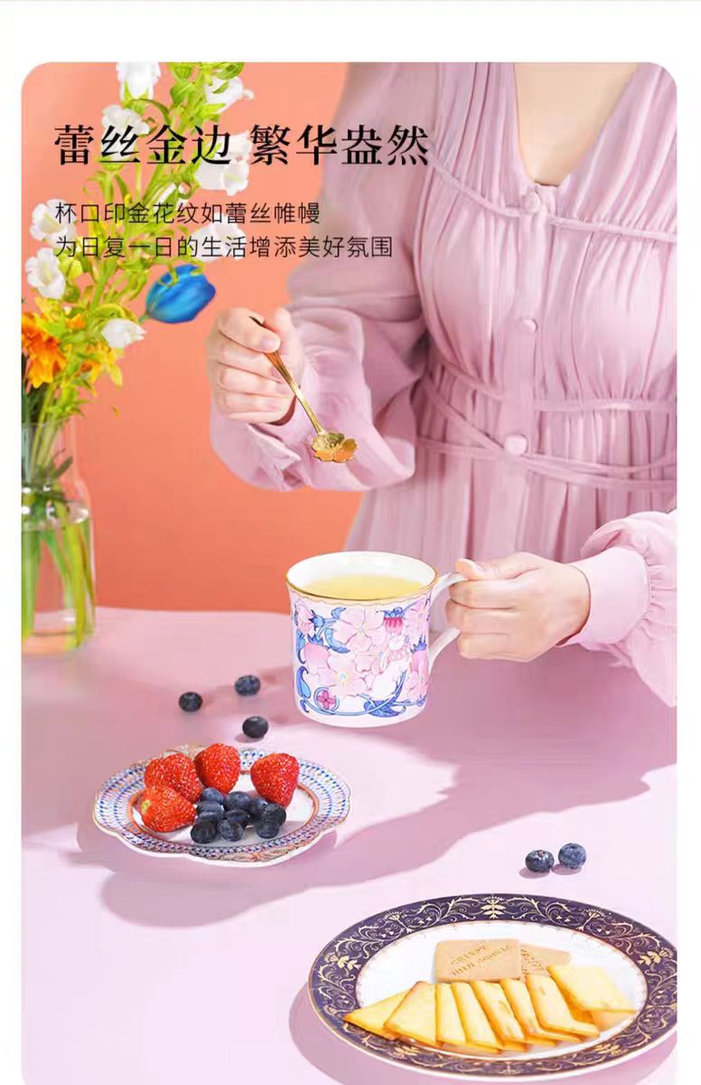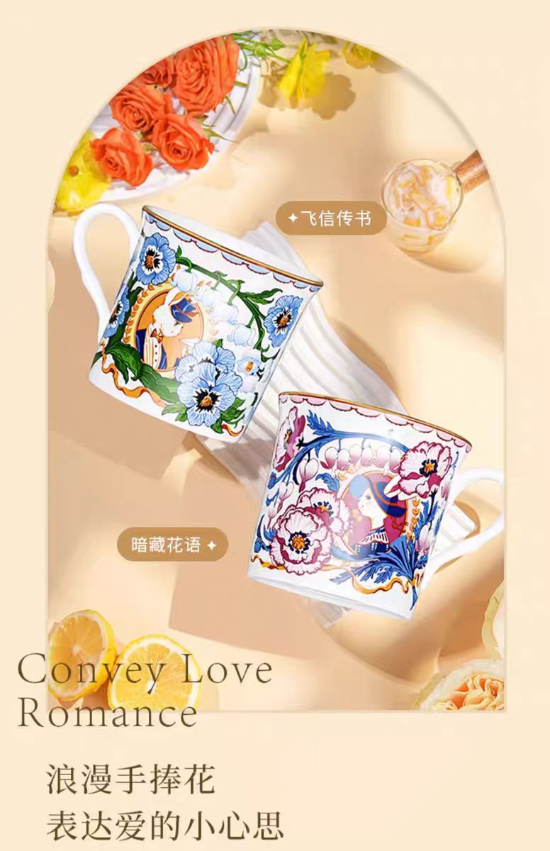 輕巧的設計,配以精緻的花卉圖案和蕾絲般的金邊,為每一口茶增添了一絲優雅。無論是奢華的茶飲體驗還是作為精美的禮物,這款茶杯都體現了高級骨瓷的美麗和工藝。