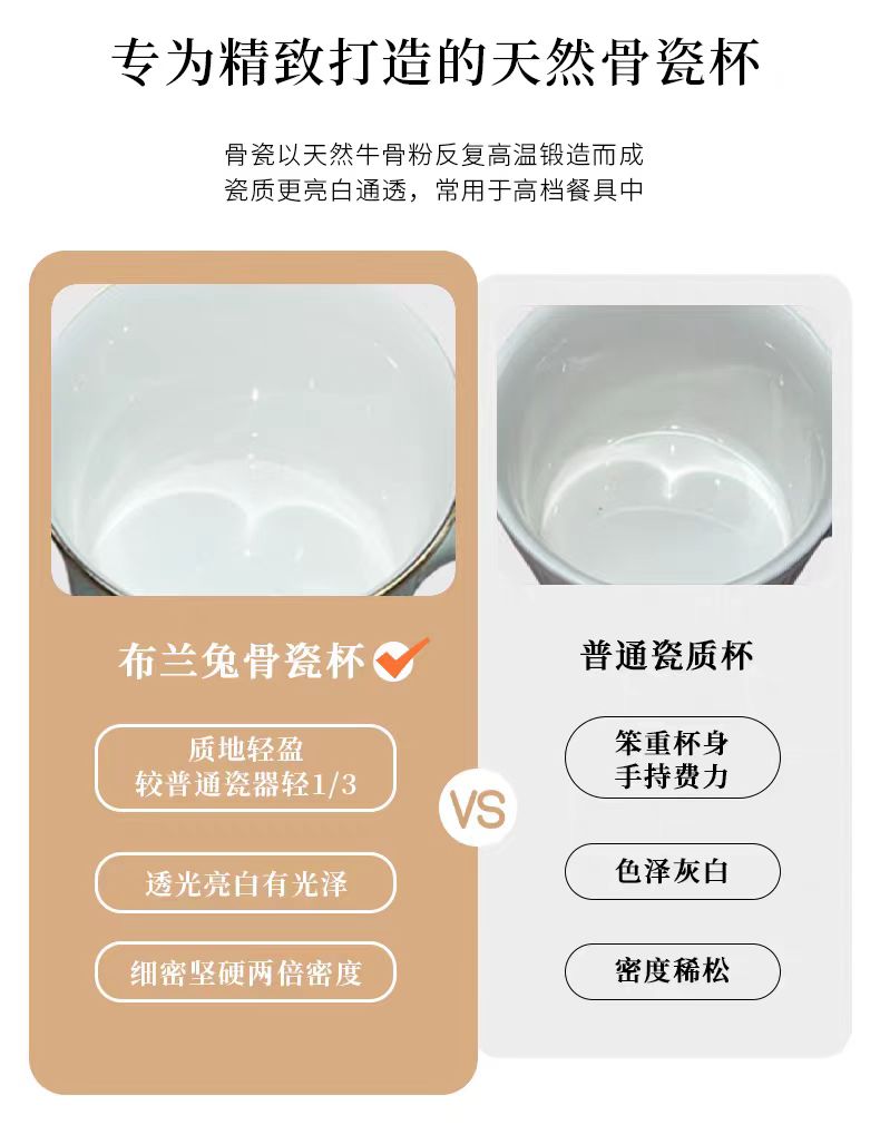 體驗優雅,布蘭兔35%骨瓷茶杯。這款茶杯由精緻的骨瓷製成,以其明亮、半透明的質量而聞名。由天然礦物骨灰製成,並在1300°C以上的高溫下燒製,這款茶杯展示出細膩、光澤的表面。在光線下,它的半透明溫暖光芒使其與普通瓷器區別開來,成為高端餐具的主打產品。