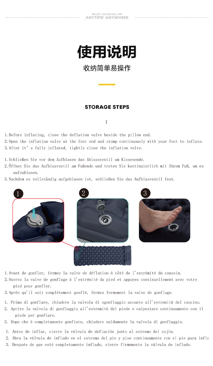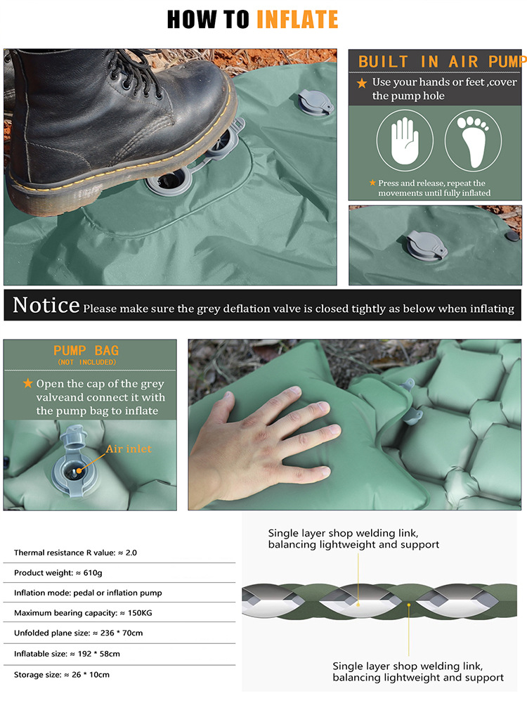 ▸內置按壓充氣泵,手壓或腳踩即可充氣。
