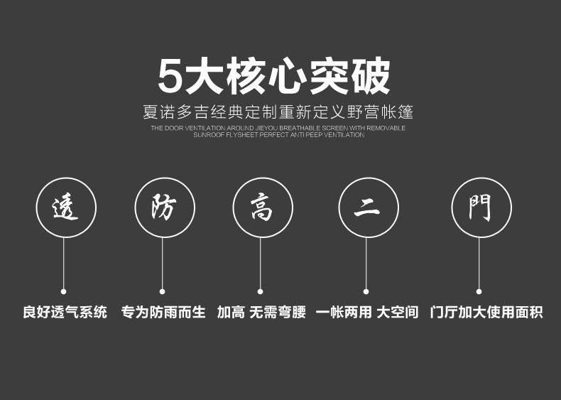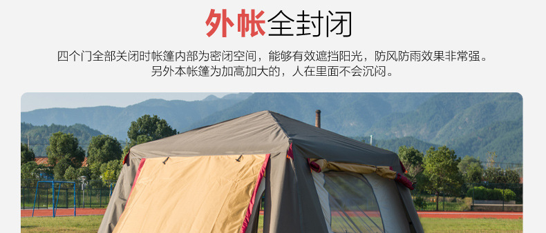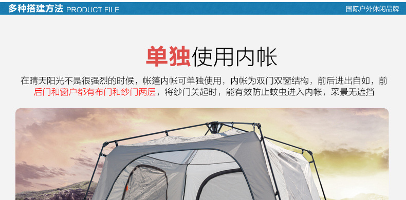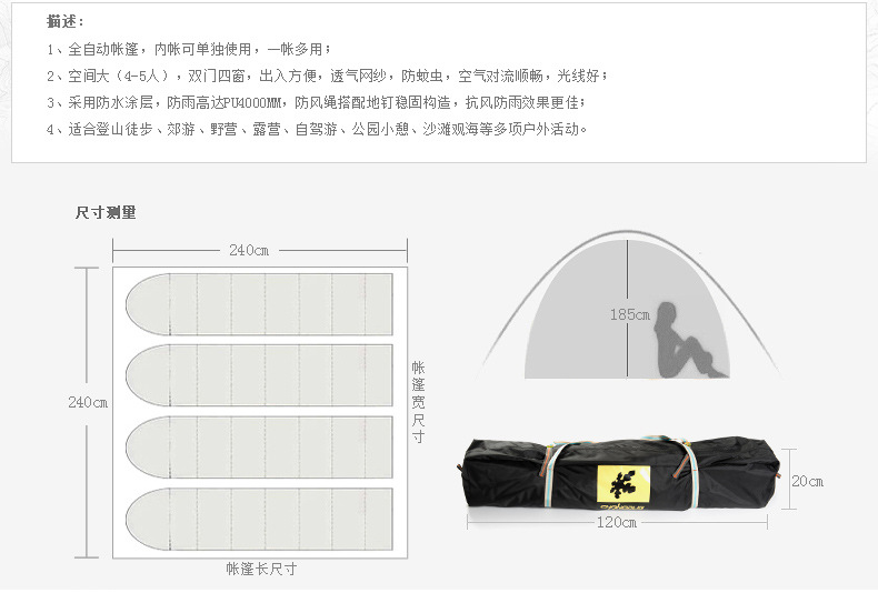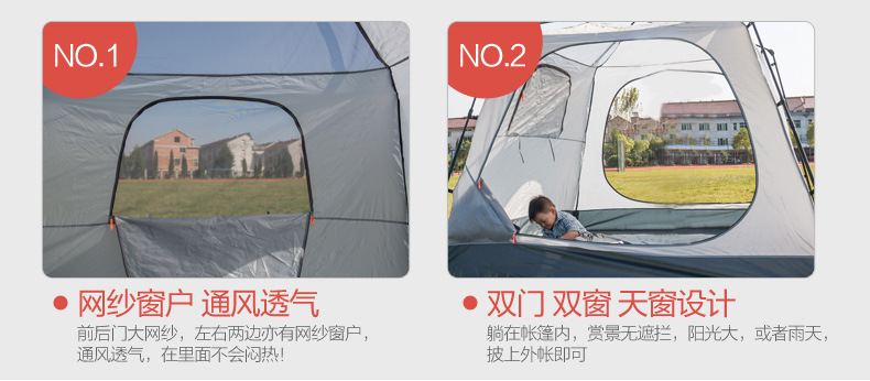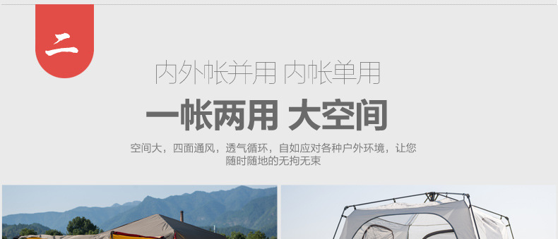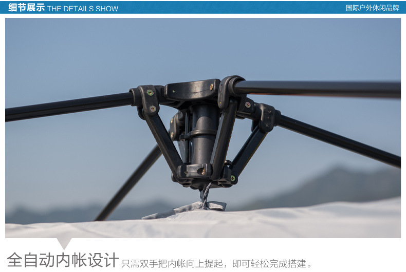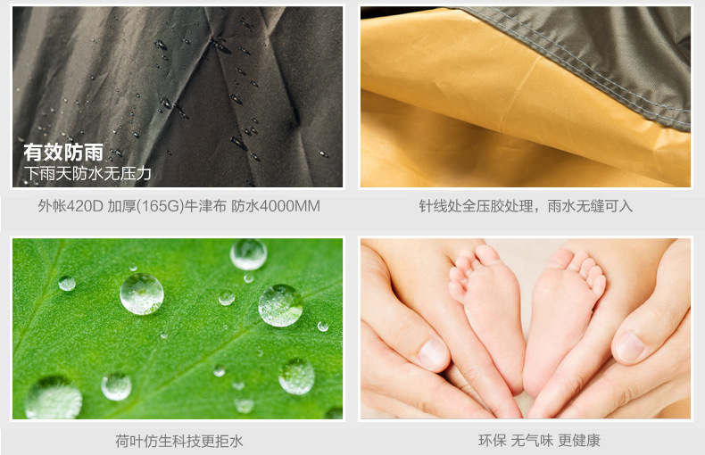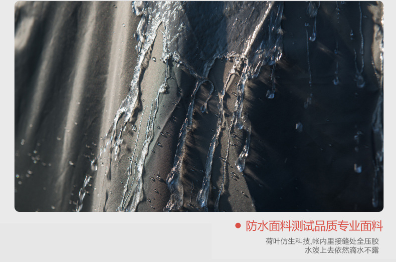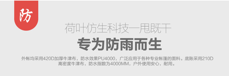 ▸外帳採用400D加厚牛津布,防水效果PU4000;底帳採用210D高密度牛津布,防水指數4000mm,採用荷葉仿生科技,賬內接縫處全壓膠,滴水不漏。