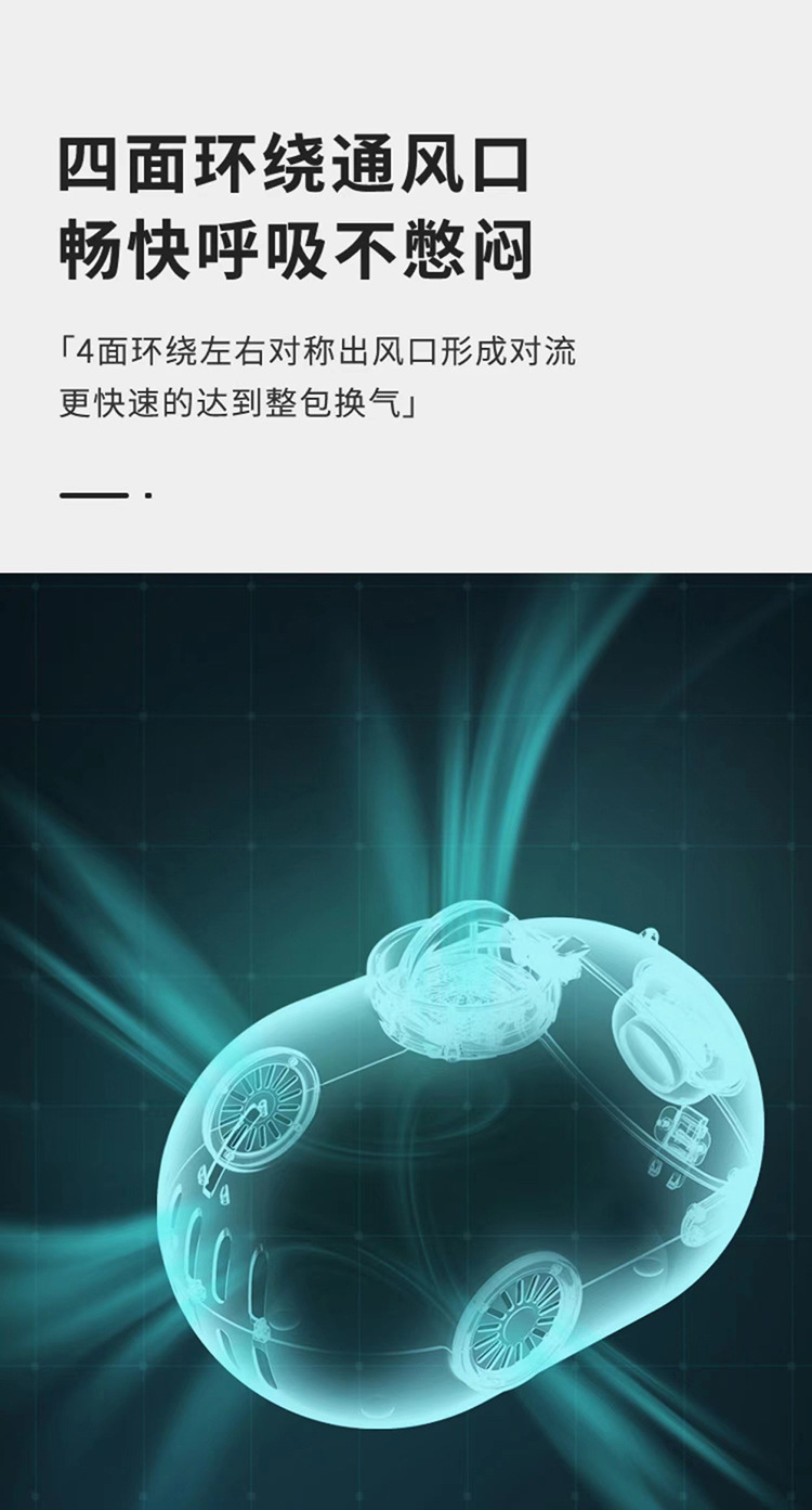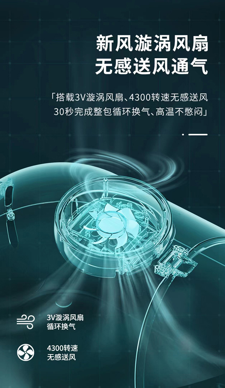 ▸搭載3V旋渦風扇,4300轉速無感送風,30秒完成整包循環換氣。