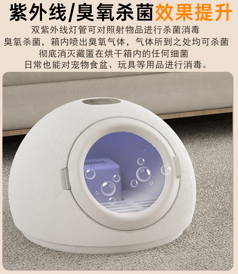 ▸紫外線/臭氧消毒:紫外線照射+釋放臭氧殺菌,日常也能對寵物食盆和玩具等進行消毒。