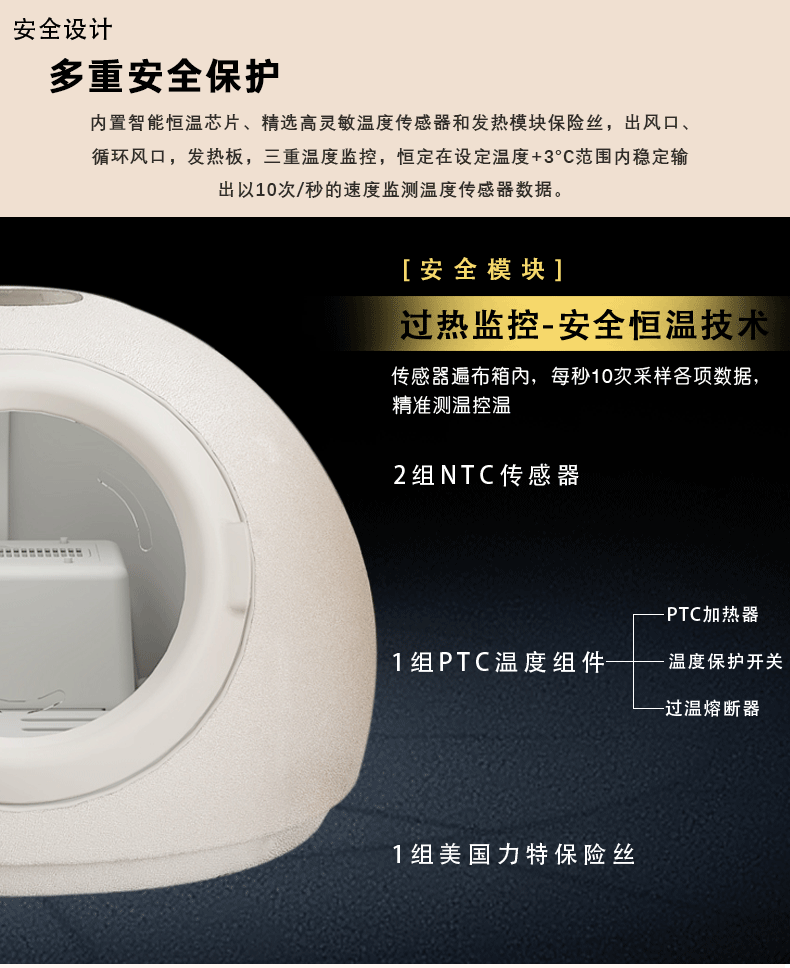 ▸多重安全保護:高靈敏傳感器遍佈箱內,每10秒採用各項數據,精準測溫防止過熱。