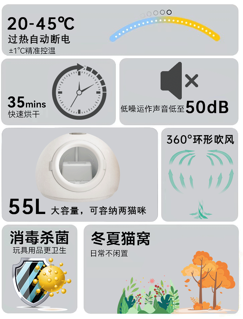 ▸底噪運作:運作聲音低至50db,風聲柔和不刺激愛寵,不影響主人休息。