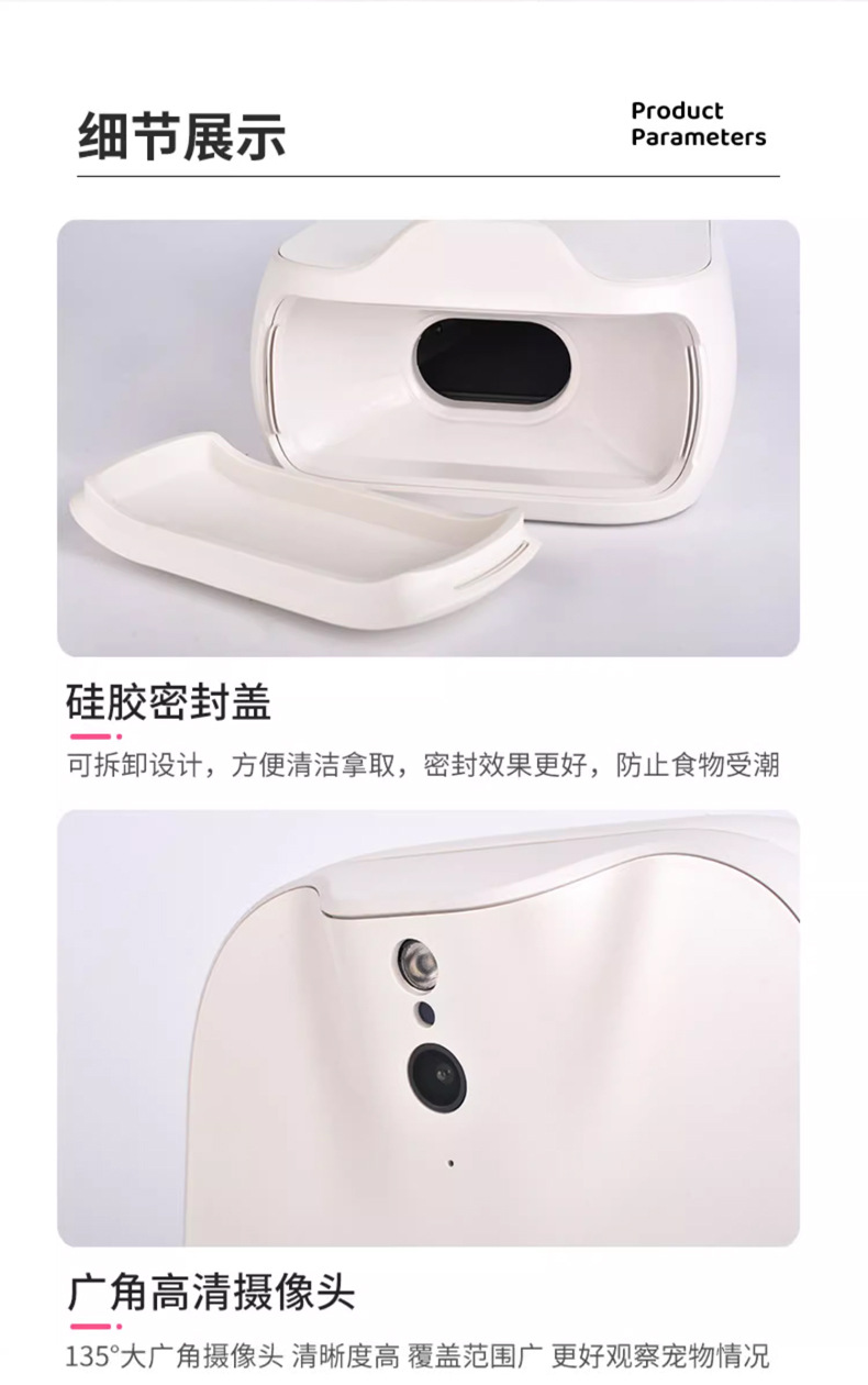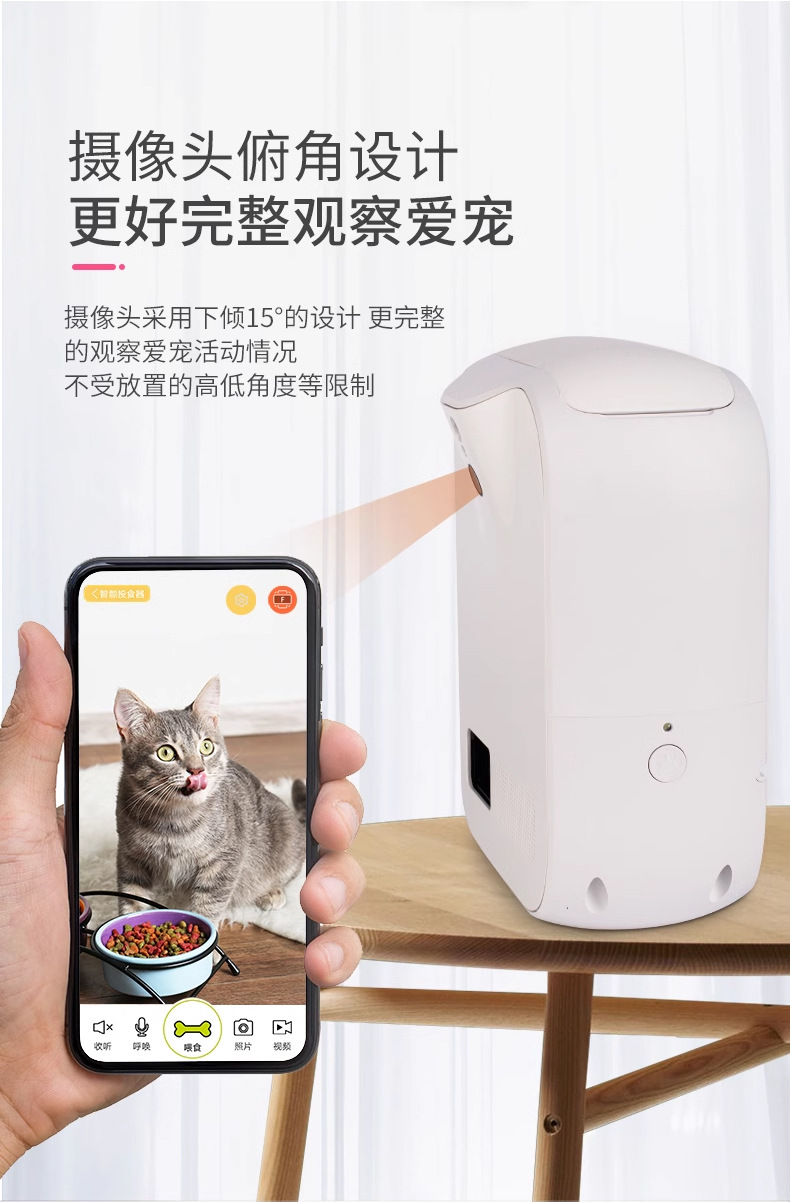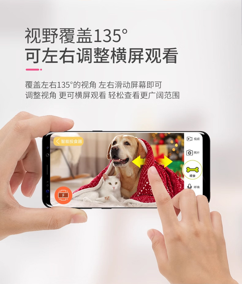 視頻監控:攝像頭下傾15°,視野覆蓋左右135°,更完整觀察愛寵。