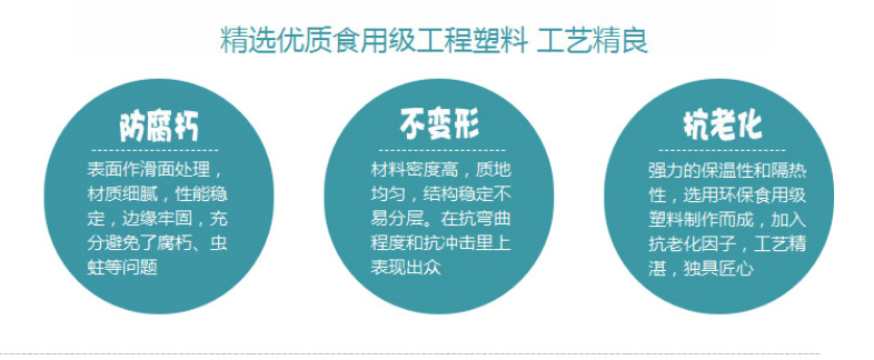 產品精選食品級工程塑料製成,加入抗老化因子。材質細膩,性能穩定,邊緣牢固,充分避免了腐朽、蟲蛀等問題,且在抗彎曲和抗衝擊方面表現出眾。