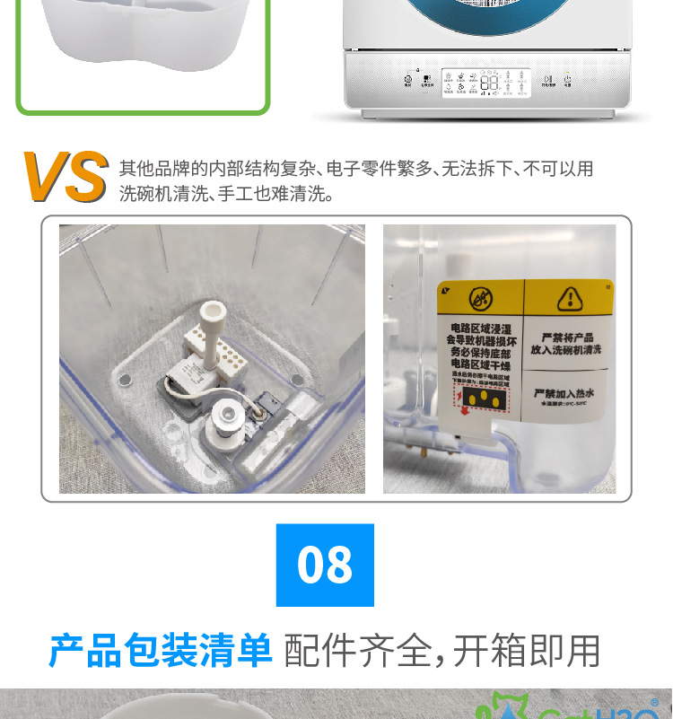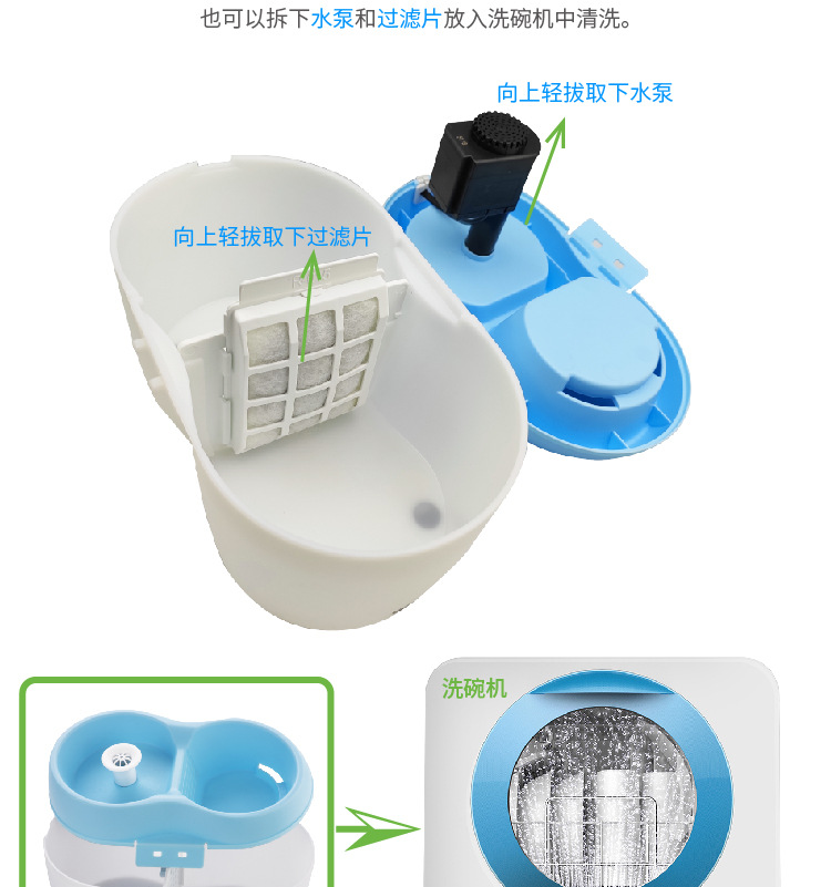 產品結構簡單,可以輕鬆拆卸,方便清洗🧽拆下水泵和過濾片後的塑料外殼可放入洗碗機清洗。