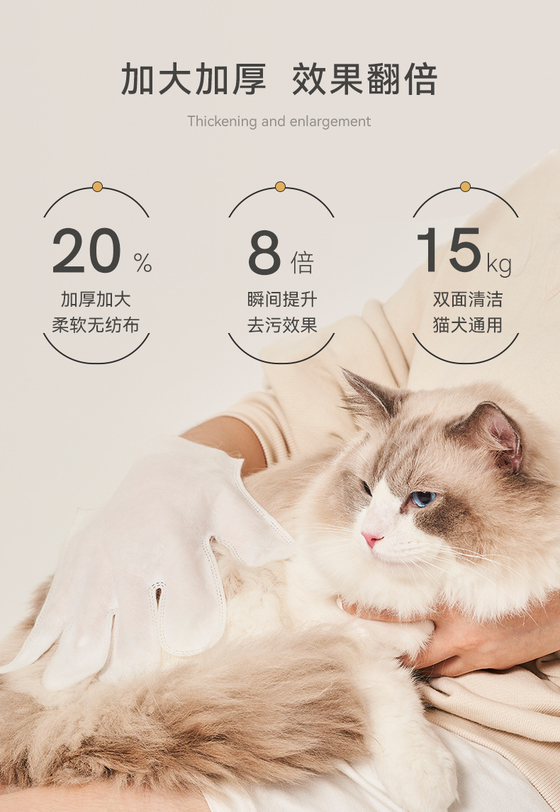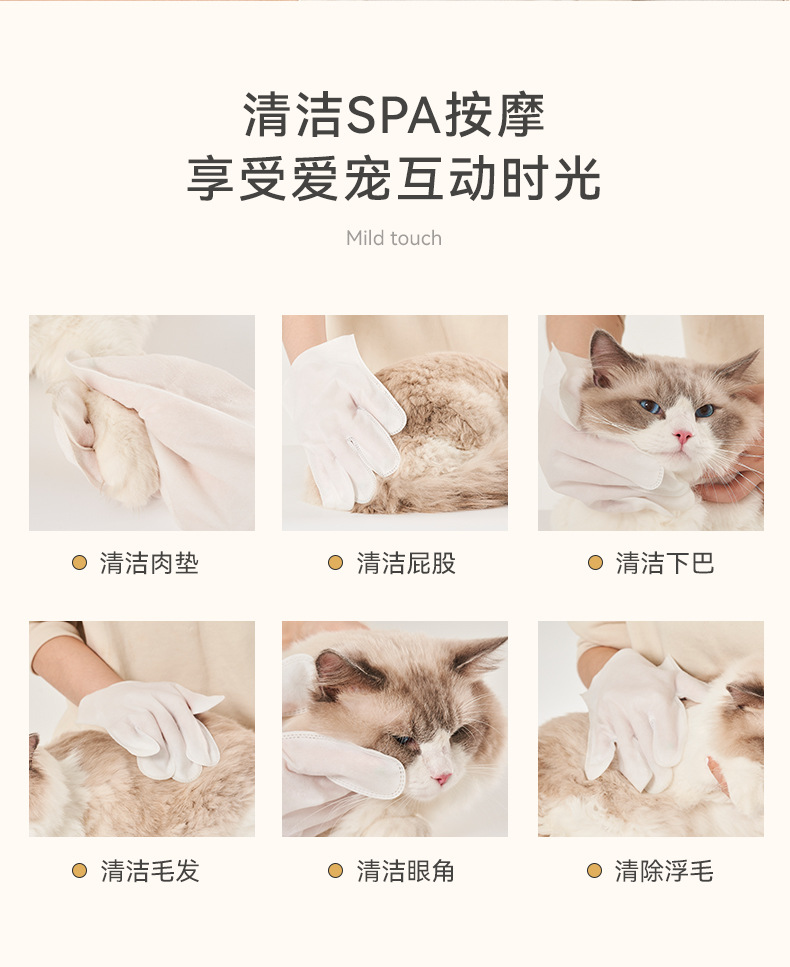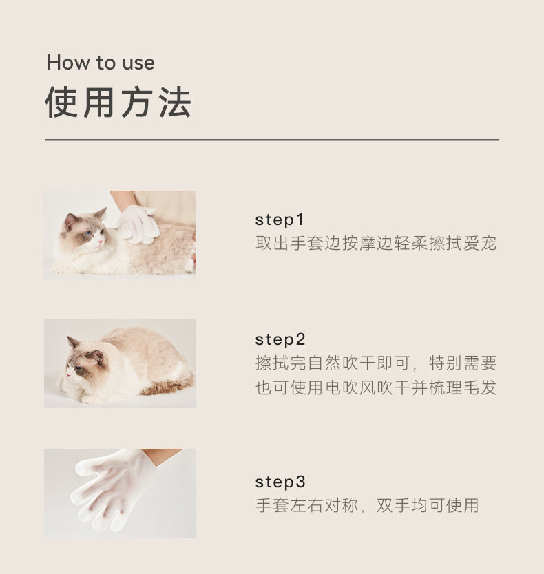 取出手套邊按摩邊輕柔擦拭愛寵