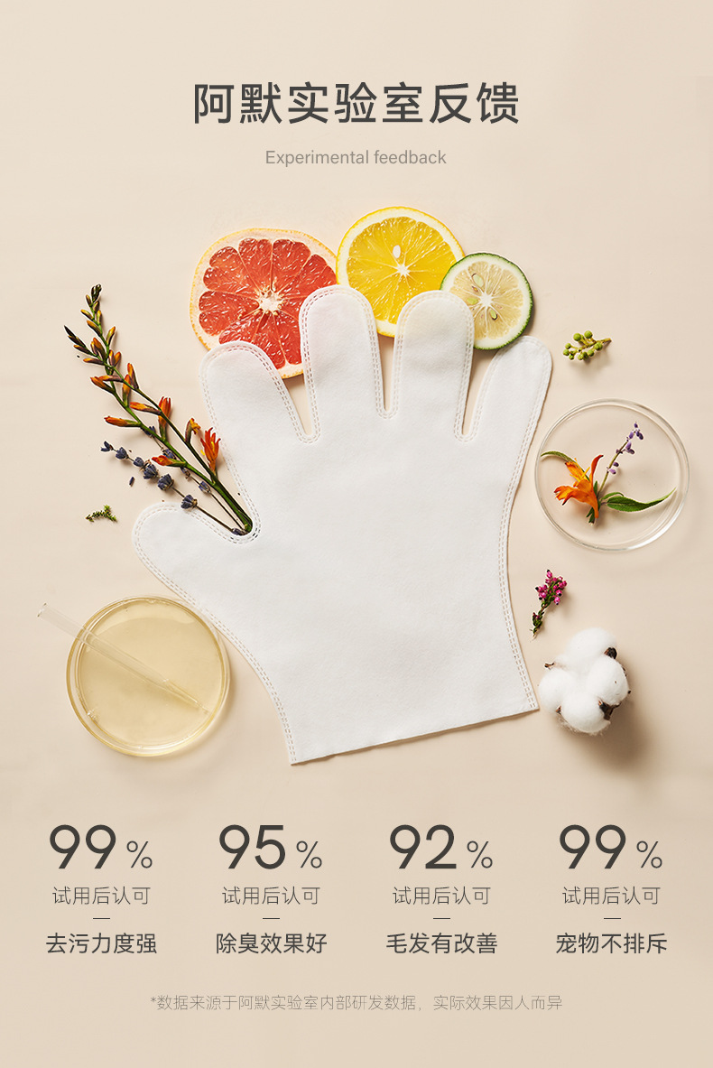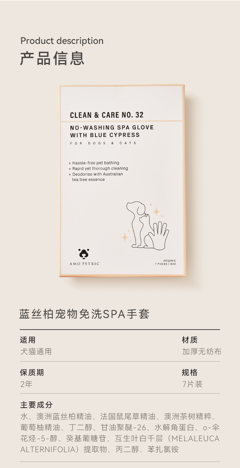 功效:寵物在秋冬季節、生理期、生病期間,不建議洗澡,為解決這一階段的洗澡雖題,我們推薦使用免洗手套進行局部或者全身清潔。阿默免洗手套特別添加澳洲藍絲柏精油、法國鼠尾草精油、澳洲茶樹精粹,有機植物提取,天然且安全,舔舐無憂。免洗手套不僅可以滿足清潔去污,同時能夠幫助毛髮健康,有效控油,緩解皮膚乾燥,氨基酸表活配方,打造愛寵潔淨安心體驗。