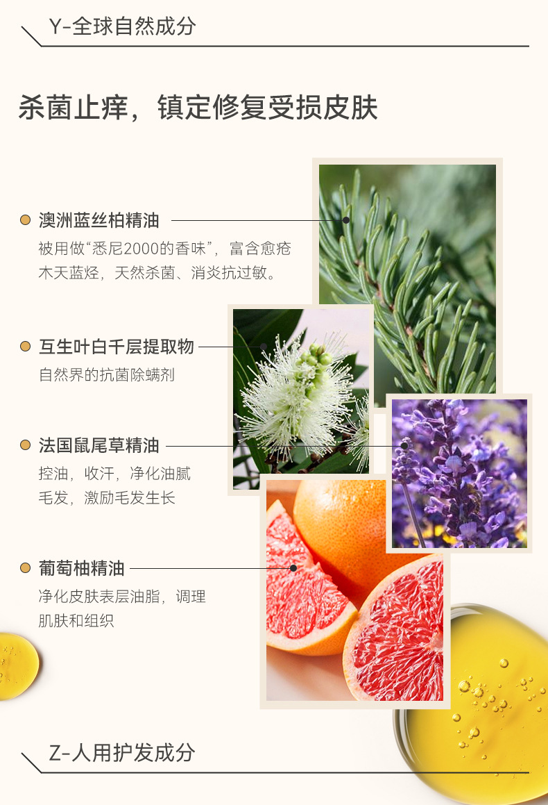 主要成分:水、澳洲藍絲柏精油、法國鼠尾草精油、澳洲茶樹精萃、葡萄柚精油、丁二醇、甘油聚醚-26、水解角蛋白、O-傘花烴-5-醇、癸基葡糖苷、互生葉白千層提取物、丙二醇、苯扎氯銨