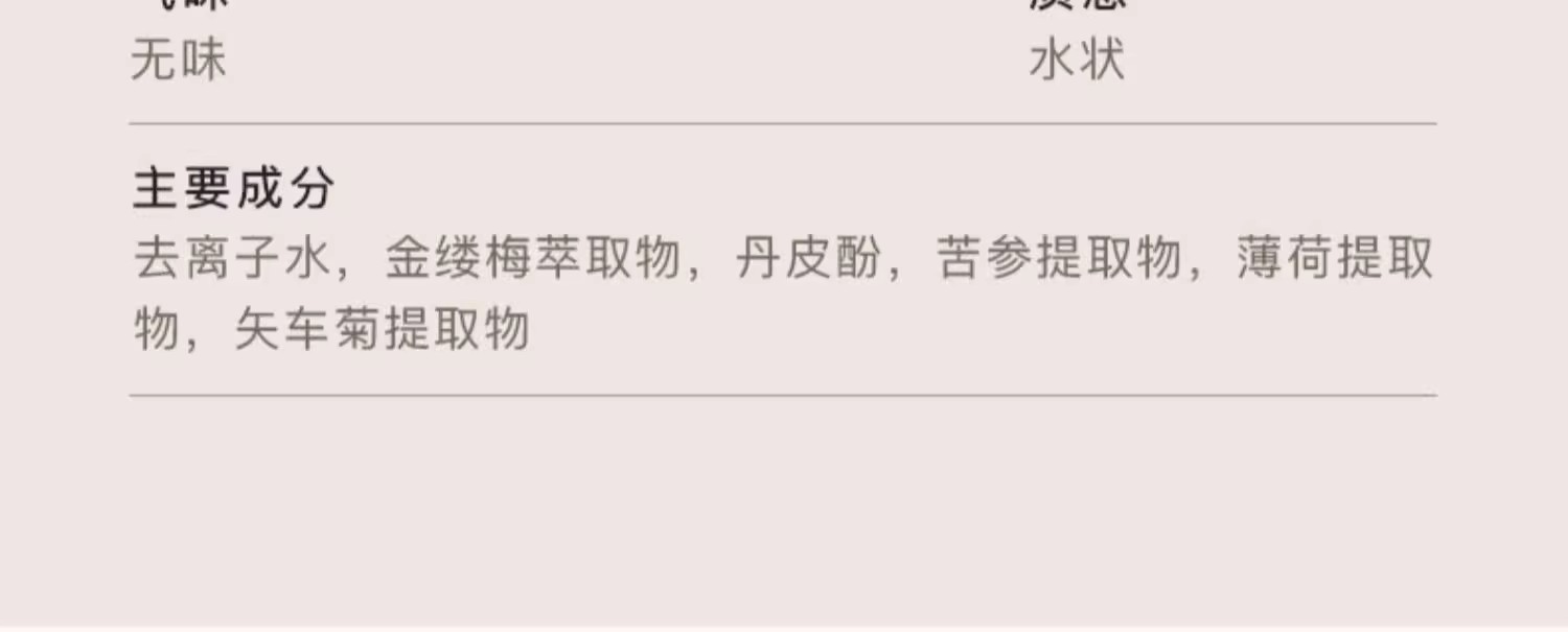 主要成分:去離子水、金縷梅萃取物、丹皮酚、苦參提取物、薄荷提取物、矢車菊提取物