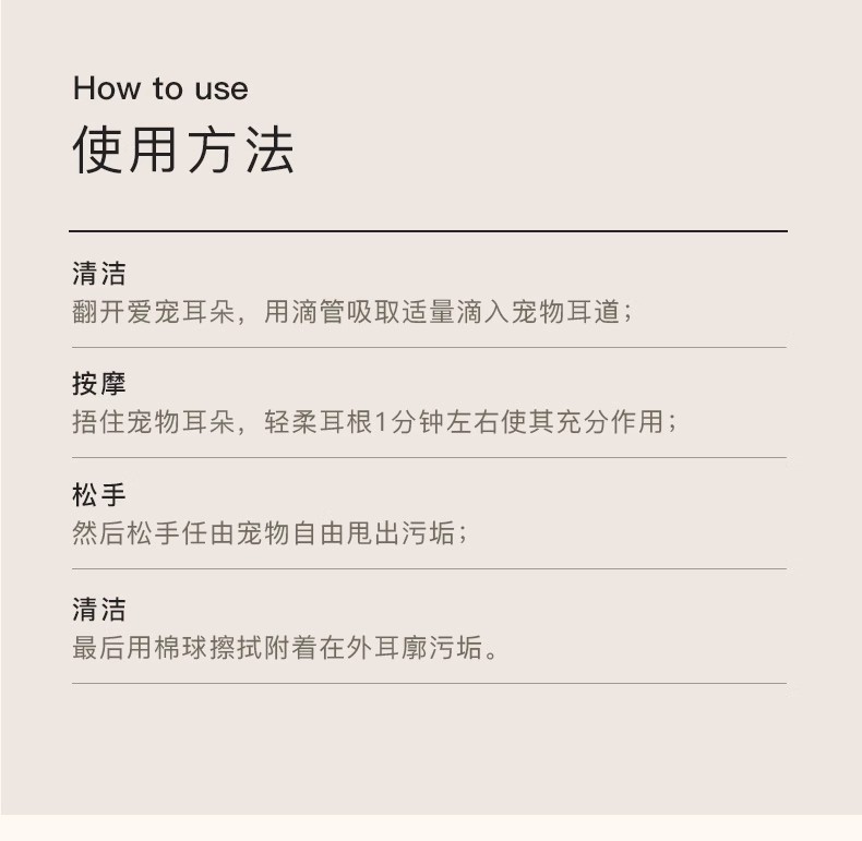 用量:小型貓犬每隻耳朵每次1/3滴管,中大型犬每隻耳朵每次1/2滴管,建議每週使用1-2次