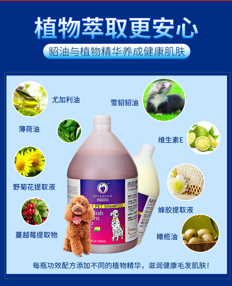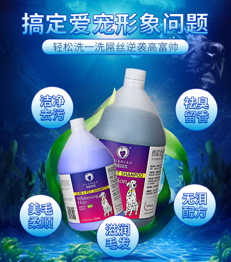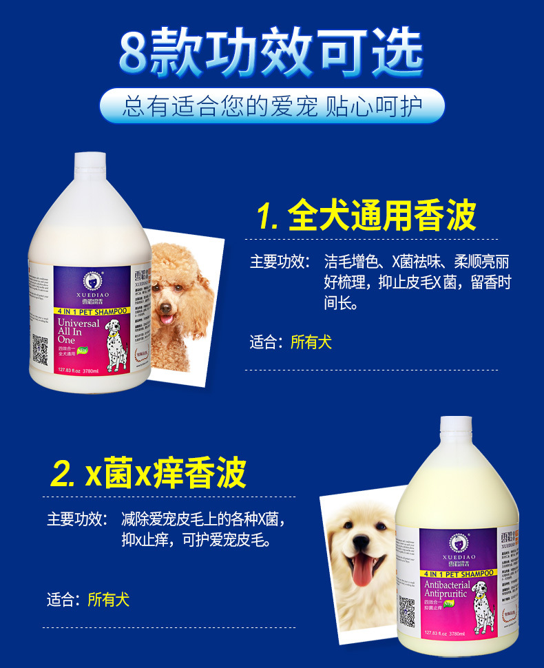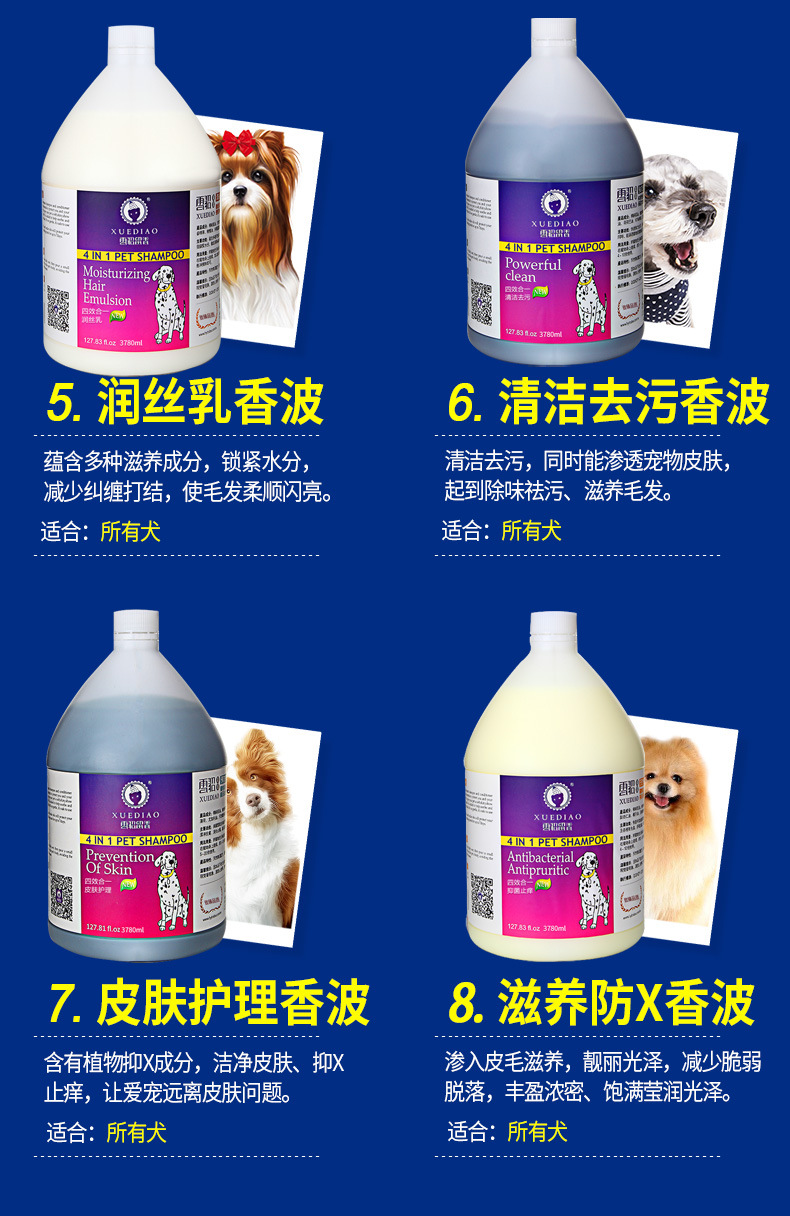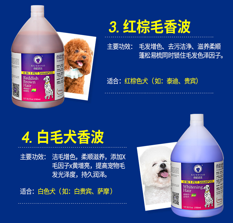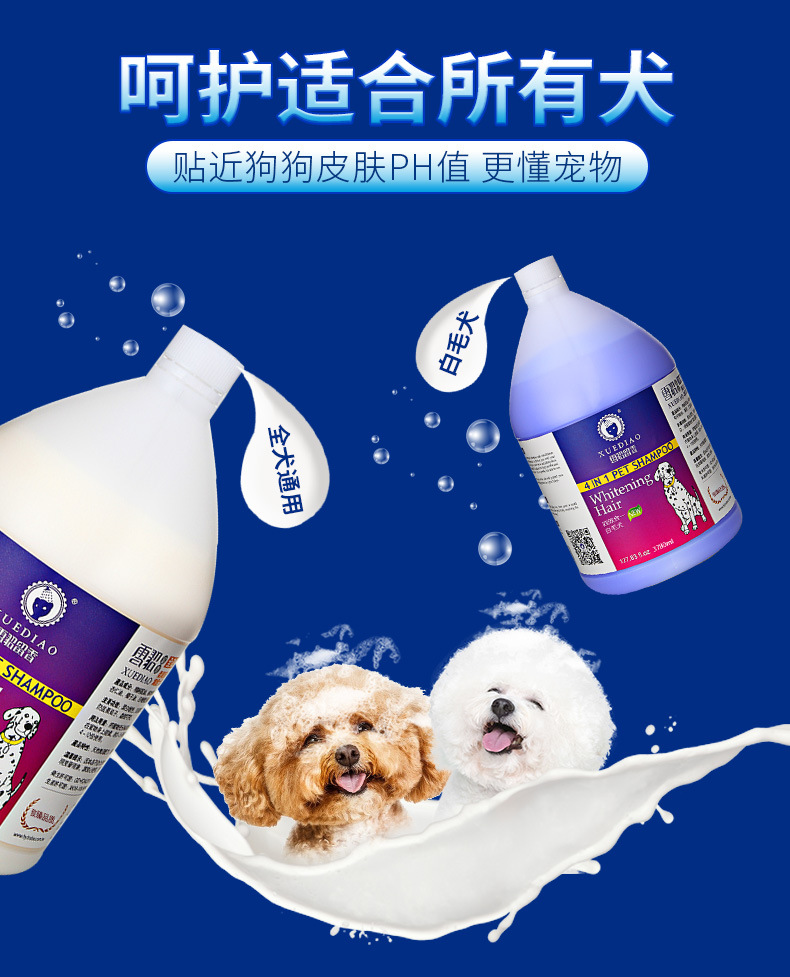 全犬通用:潔白增色、抑菌祛味、柔順亮麗好梳理,抑制皮毛細菌,持久留香。