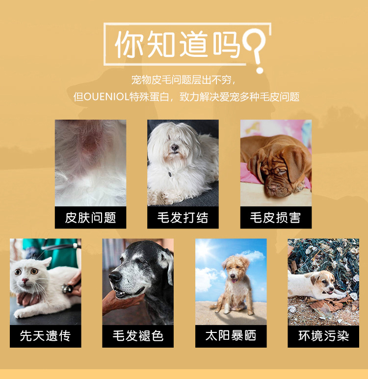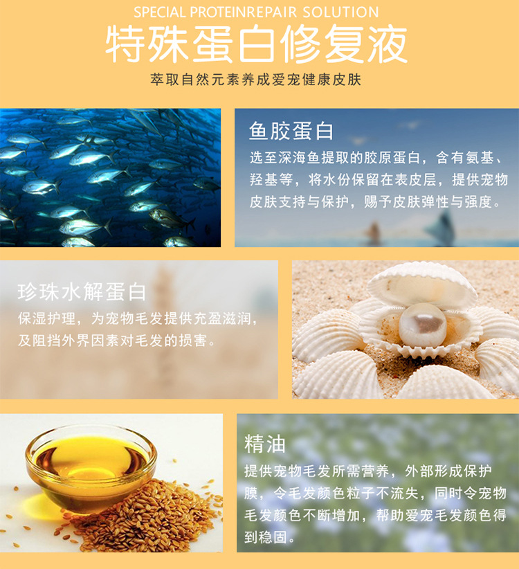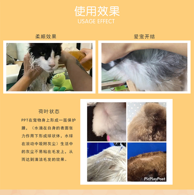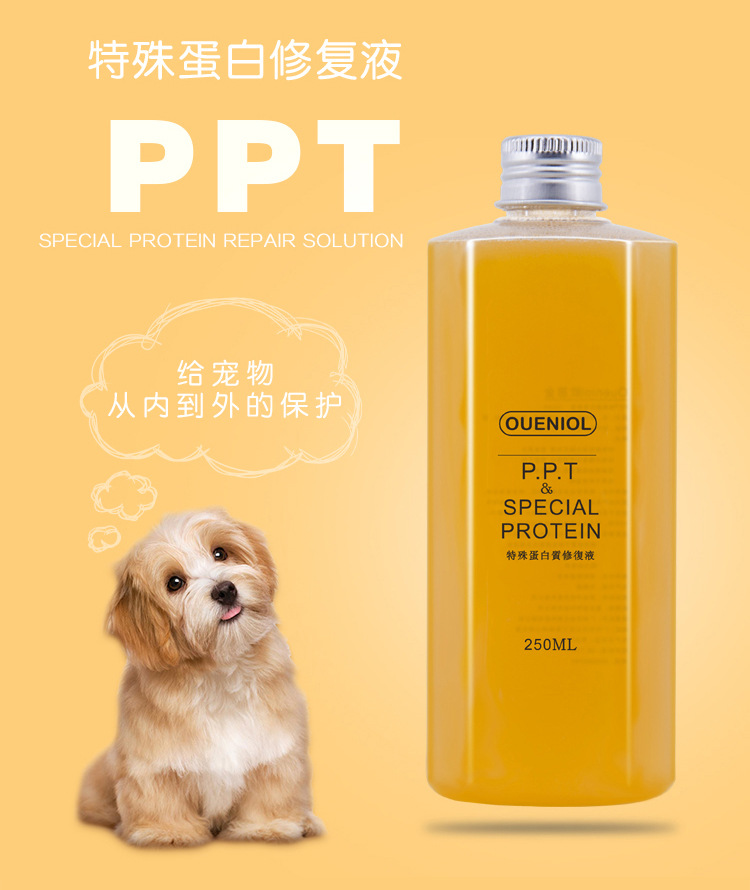 P.P.T.高滲透性,可以給毛髮必備的蛋白。牢牢鎖住水的同時,外部還配合植物精油形成保護膜,確保色素粒子不再流失,再由寵物機體生產色素粒子不斷補充增加,P.P.T.將其通通包裹在毛髮內部,從而使家中愛寵的毛髮色素得到提升甚至超越從前。