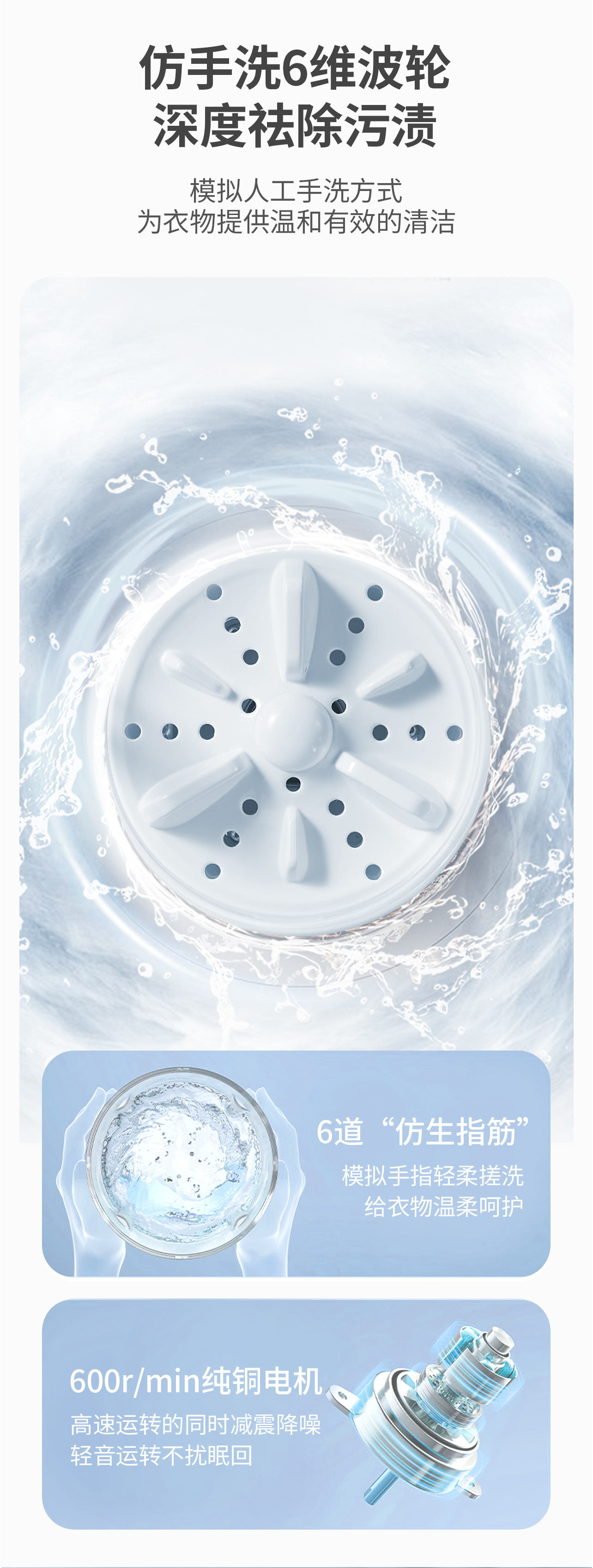 ● 仿手洗六維波輪,為衣物提供溫和有效的清潔。
