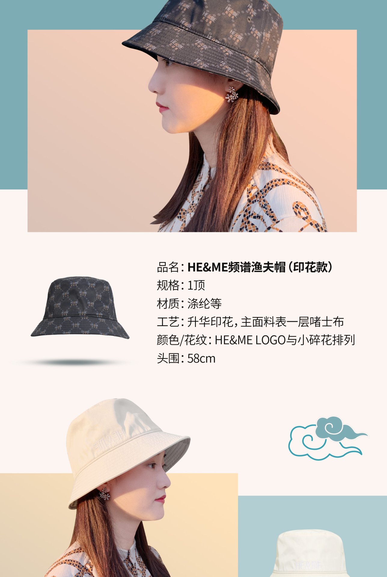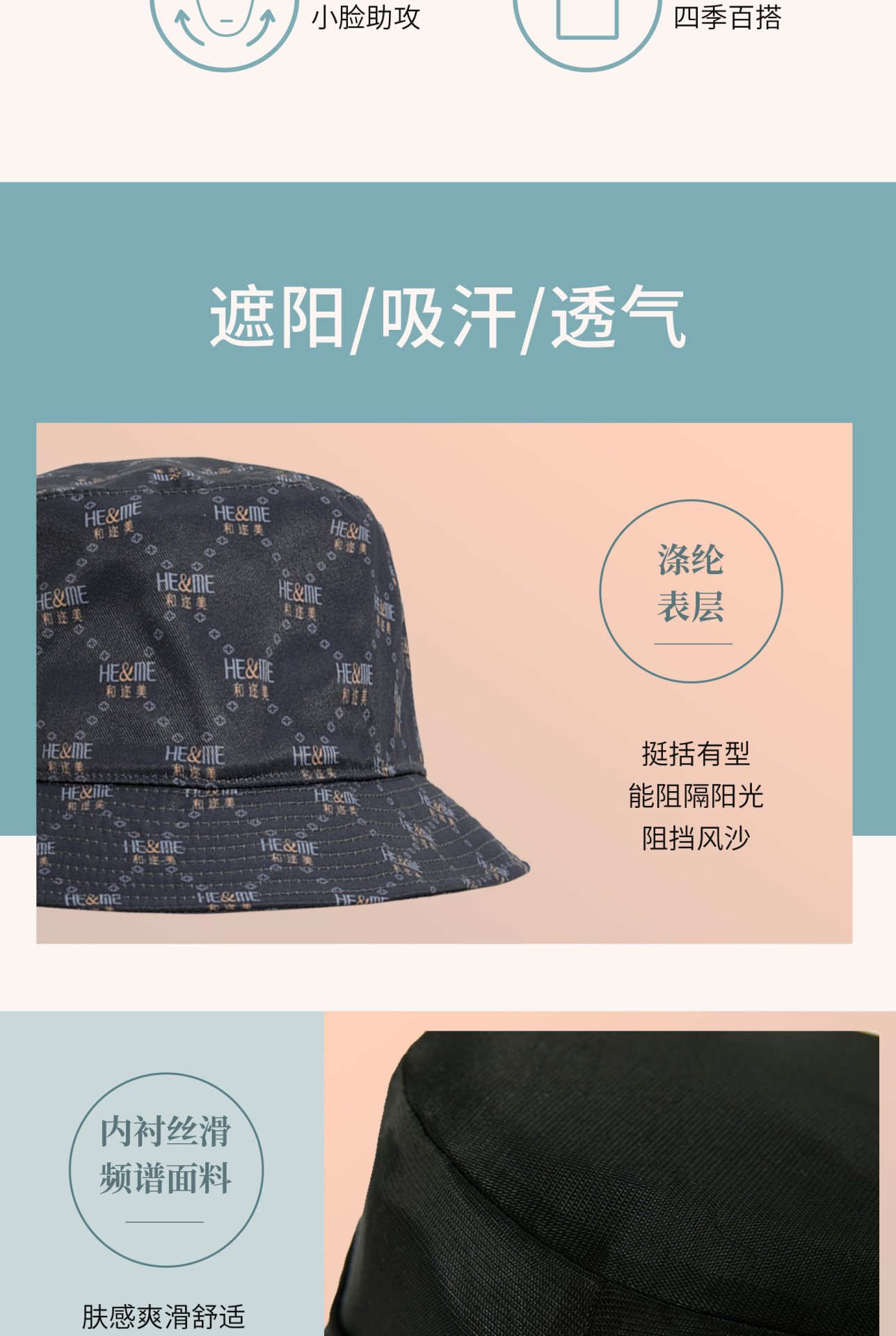 專利頻譜面料,促進微循環 HE&ME 頻譜漁夫帽採用日本 KAKEN 全球權威檢測認證的頻譜面料,有助於改善頭部血液循環,減少長時間佩戴帽子帶來的不適感,為頭部提供額外健康支持。
