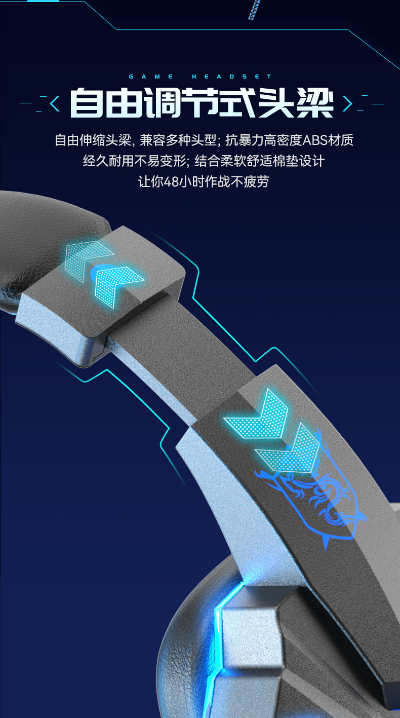 ▸自由調節式頭梁:自由伸縮頭梁兼容多種頭型。抗暴力高密度ABS材質製造,經久耐用不易變形,結合柔軟舒適的棉墊設計,讓玩家48小時作戰不疲勞。