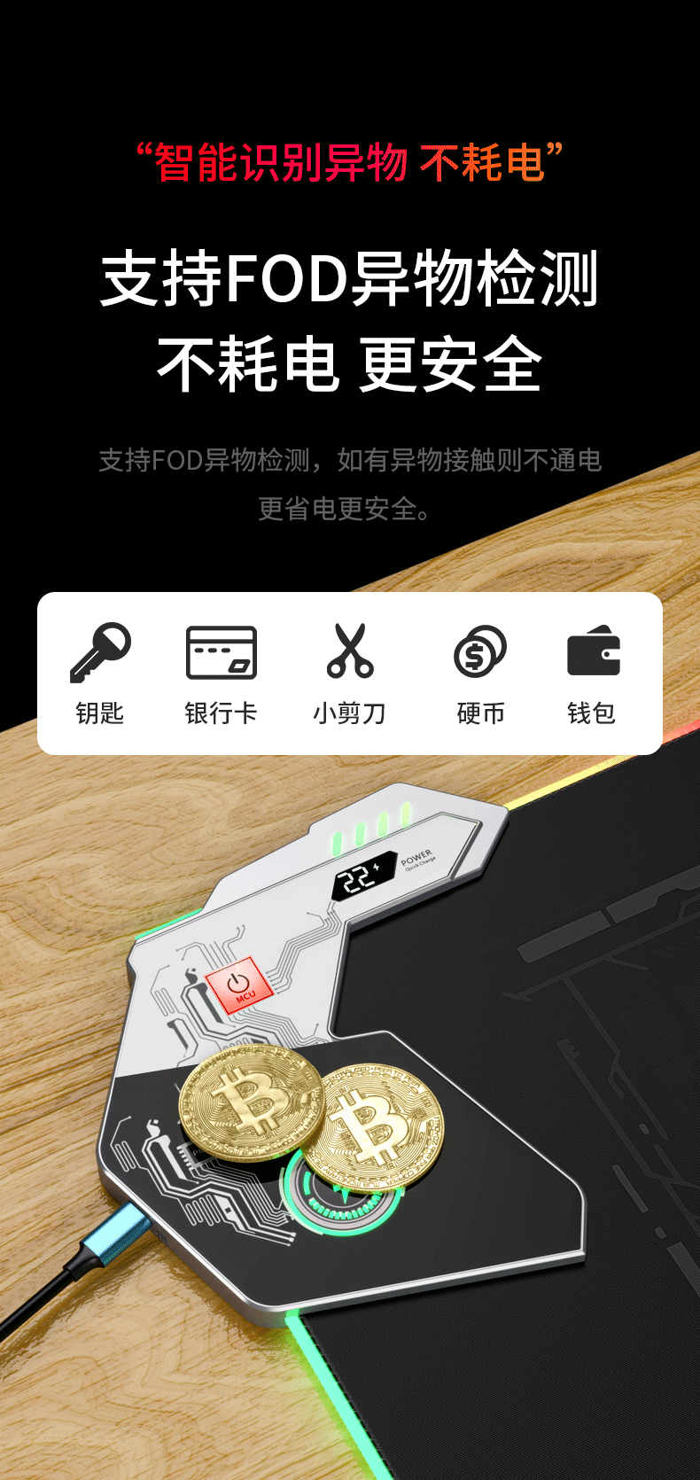 ▸支持FOD異物檢測,如有異物(鑰匙、銀行卡、小剪刀、硬幣、錢包...)接觸即不通電,更省電更安全。
