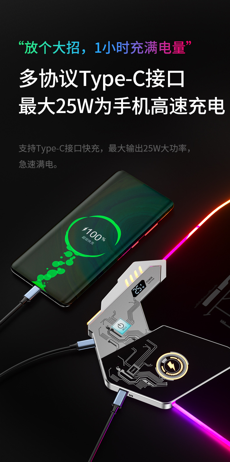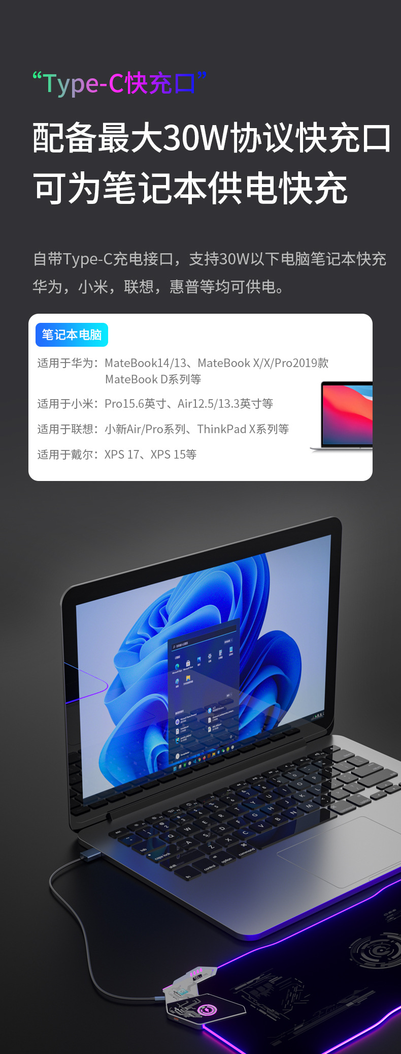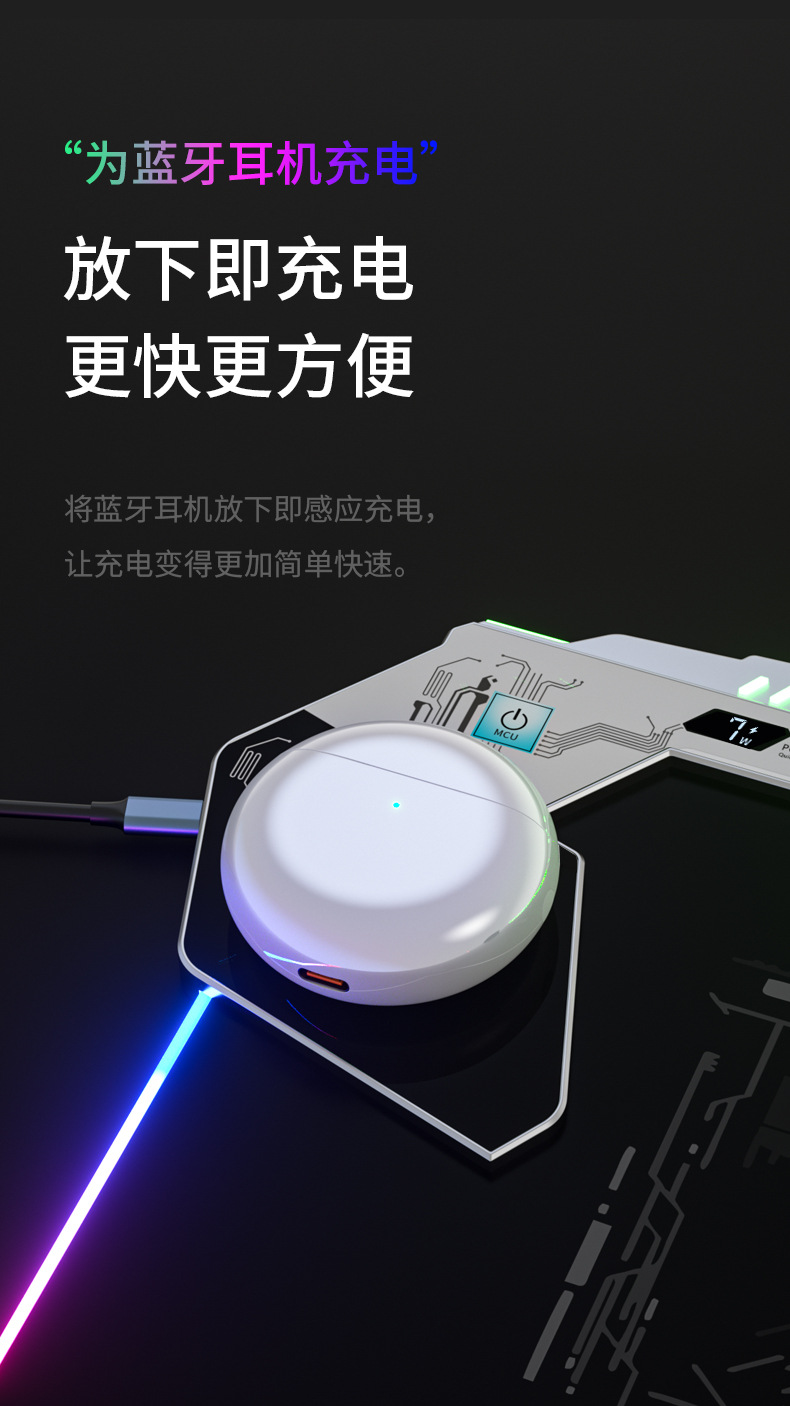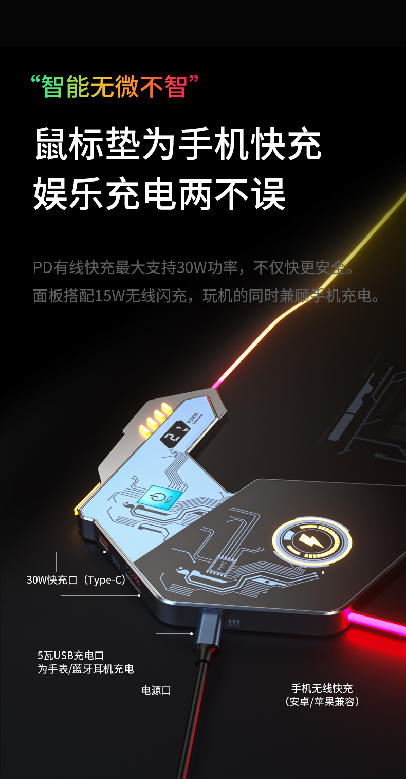 ▸鼠標墊為手機/藍牙耳機快充(type C,USB,無線),娛樂充電兩不誤。