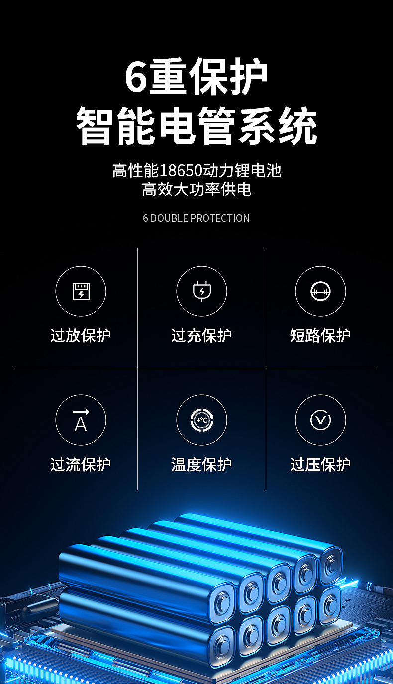 ▸6重保護智能電管系統:過放保護,過充保護,短路保護,過流保護,溫度保護,過壓保護。