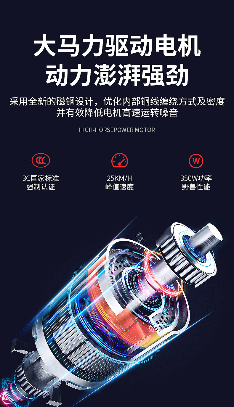 ▸大馬力驅動電機:採用全新的磁鋼設計,優化內部銅線纏繞方式及密度,有效降電機高速運轉噪音。