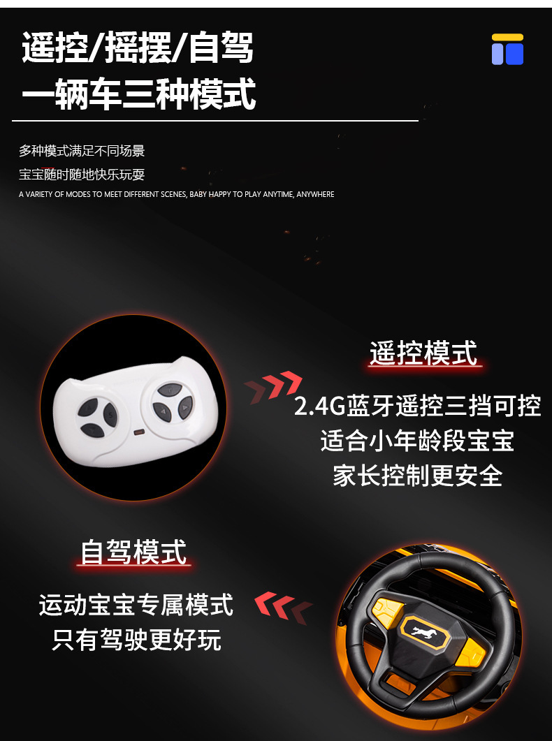 1. 遙控模式:2.4G藍牙遙控,三檔可控,適合小年齡段寶寶,家長控製更安全。