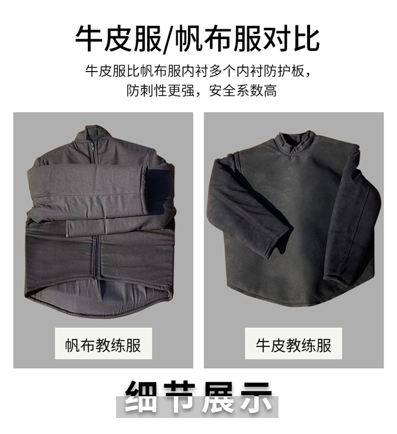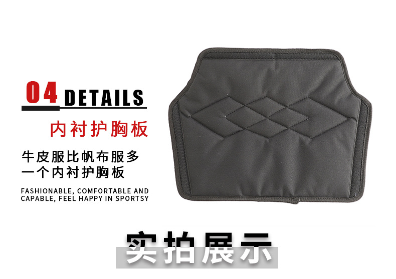 ▸牛皮服比帆布服多一個內襯護胸板,防刺性更高好,安全系數更高。