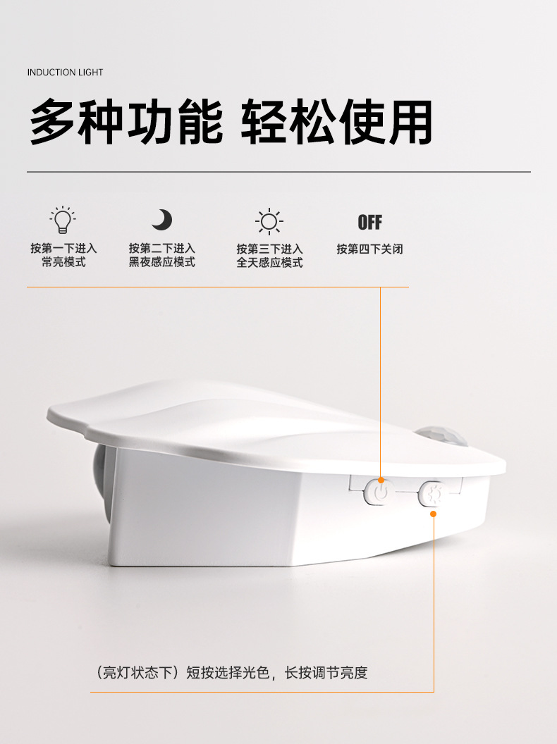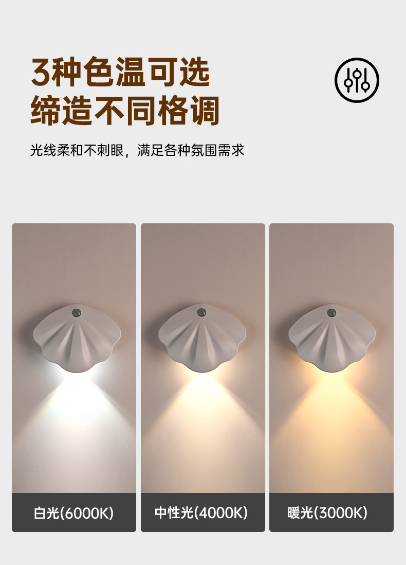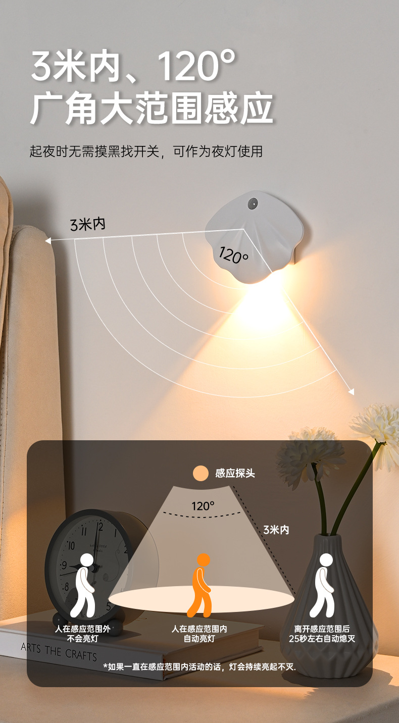 ▸3米內120°廣角大範圍感應,起夜無需摸黑找開關,可作夜燈使用。