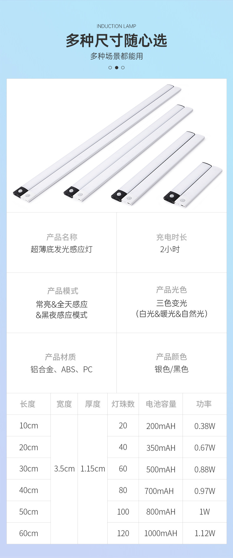 50*3.4*1.15cm(100燈珠,800mAh電池容量,1W功率)