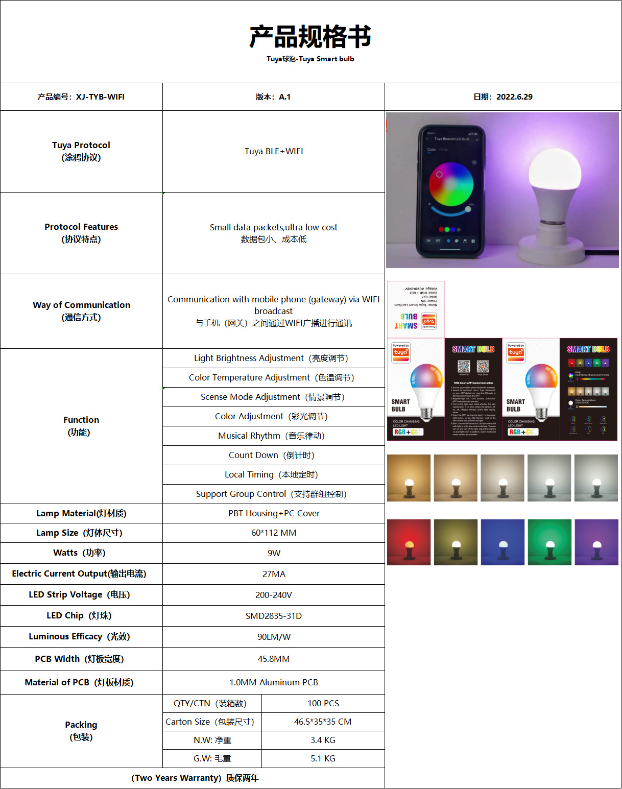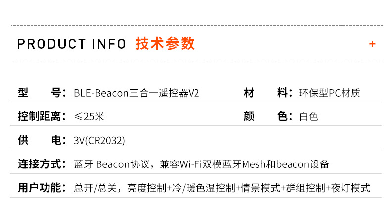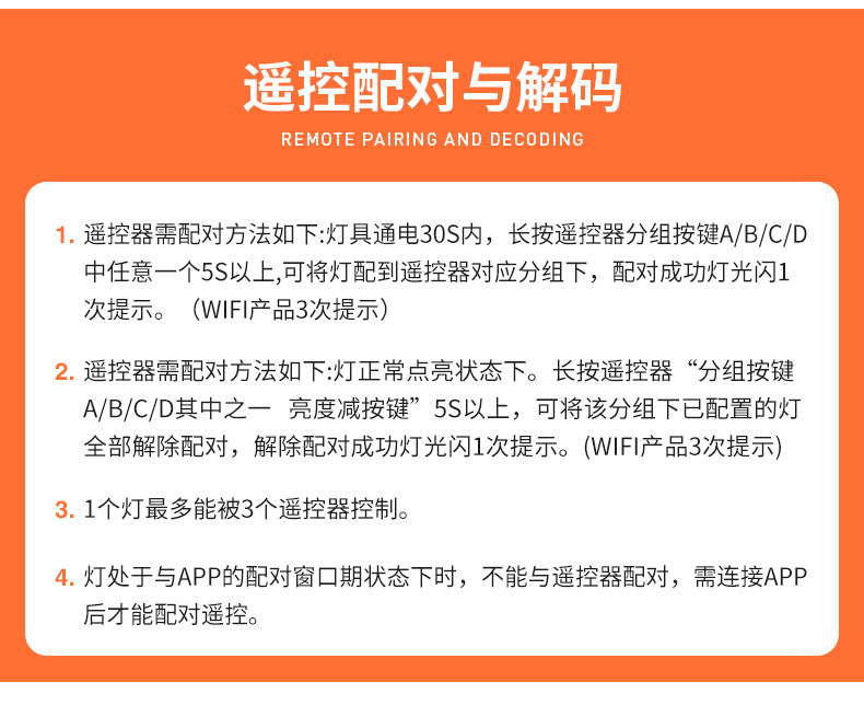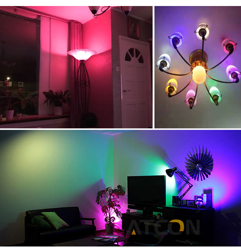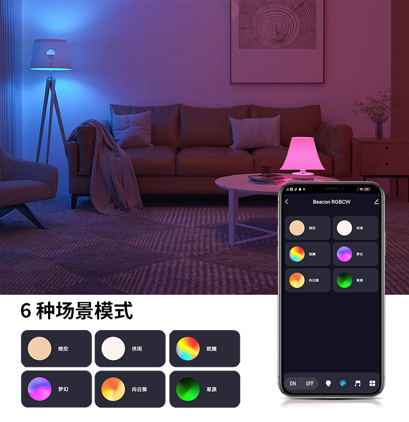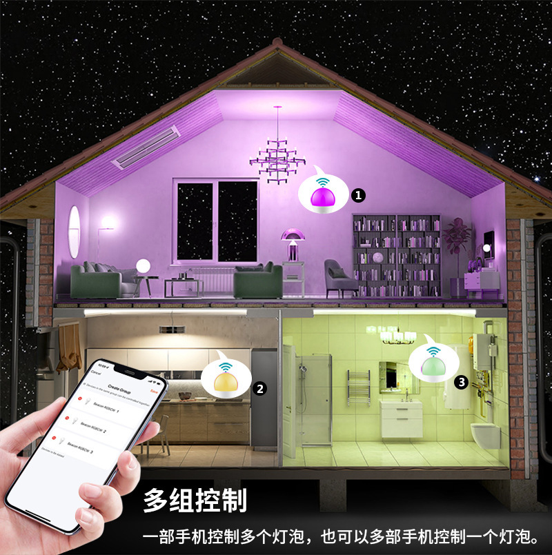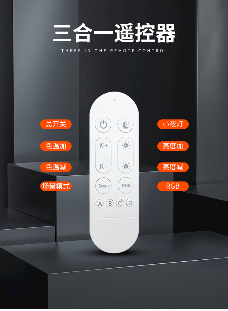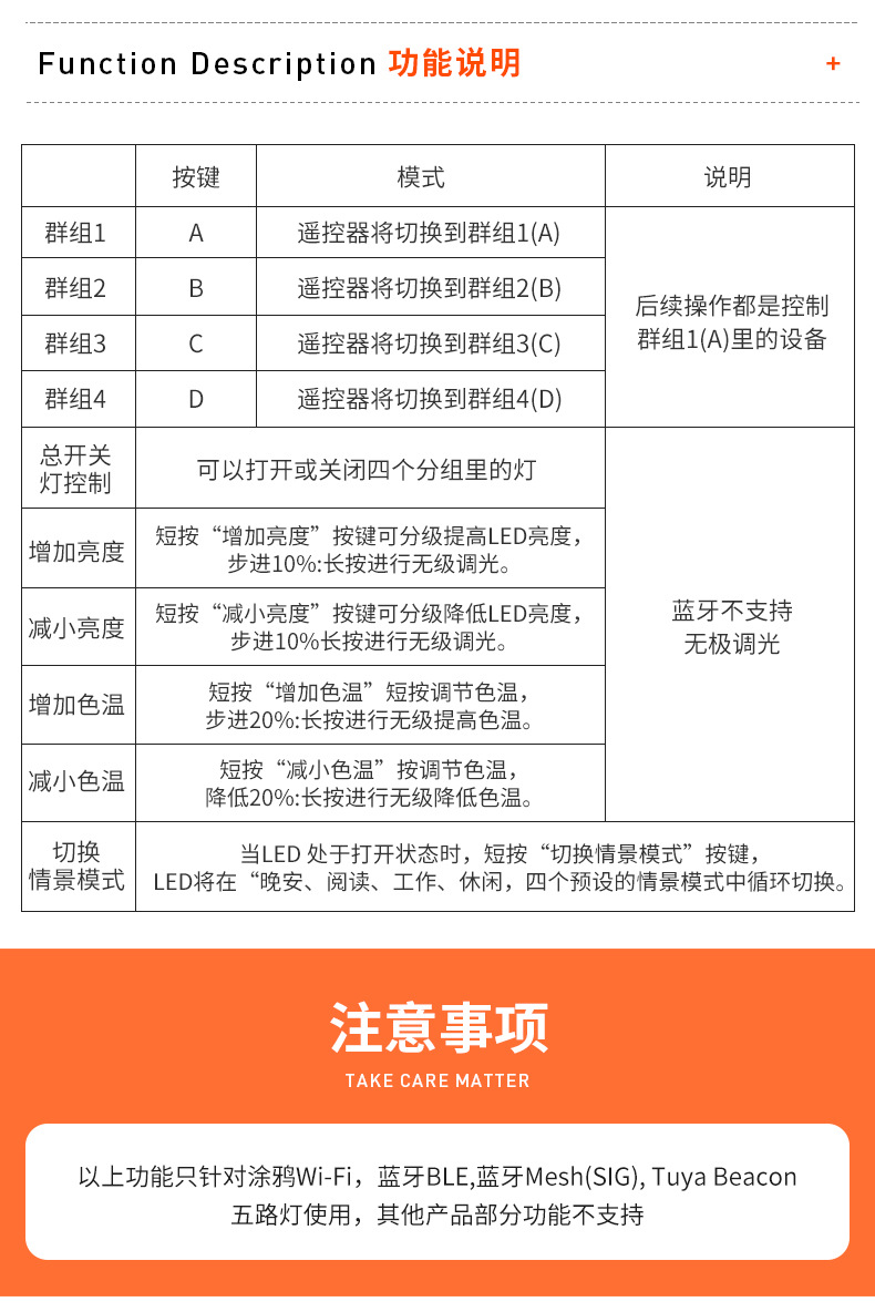 功能:亮度調節、色溫調節、情景調節、彩光調節、音樂律動、倒計時、本地定時、支持群組控制