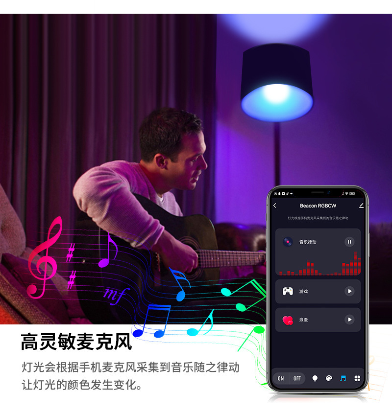 ▸燈光會根據手機麥克風採集到的音樂隨之律動,讓顏色發生變化。