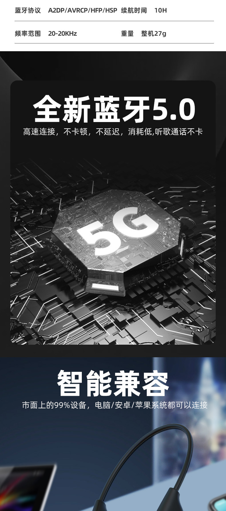 ▸全新藍牙5.0,高速連接,消耗低,不卡頓不延遲,聽歌通話不卡。