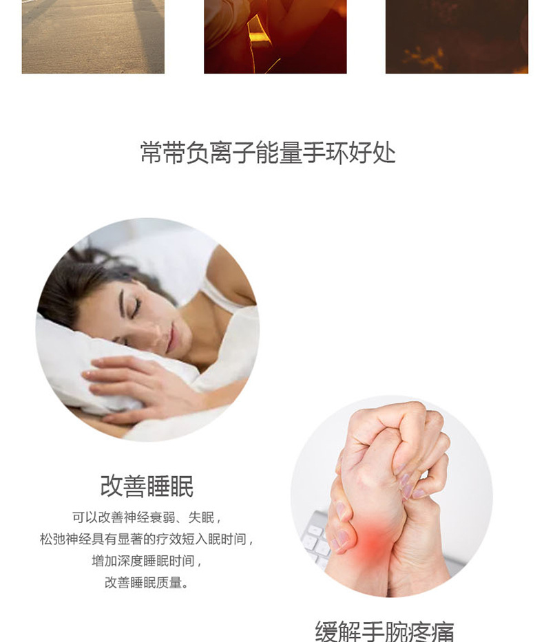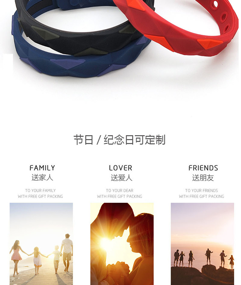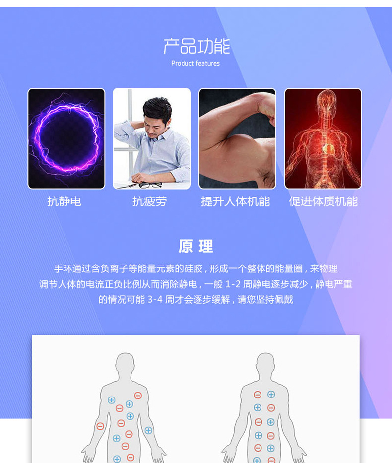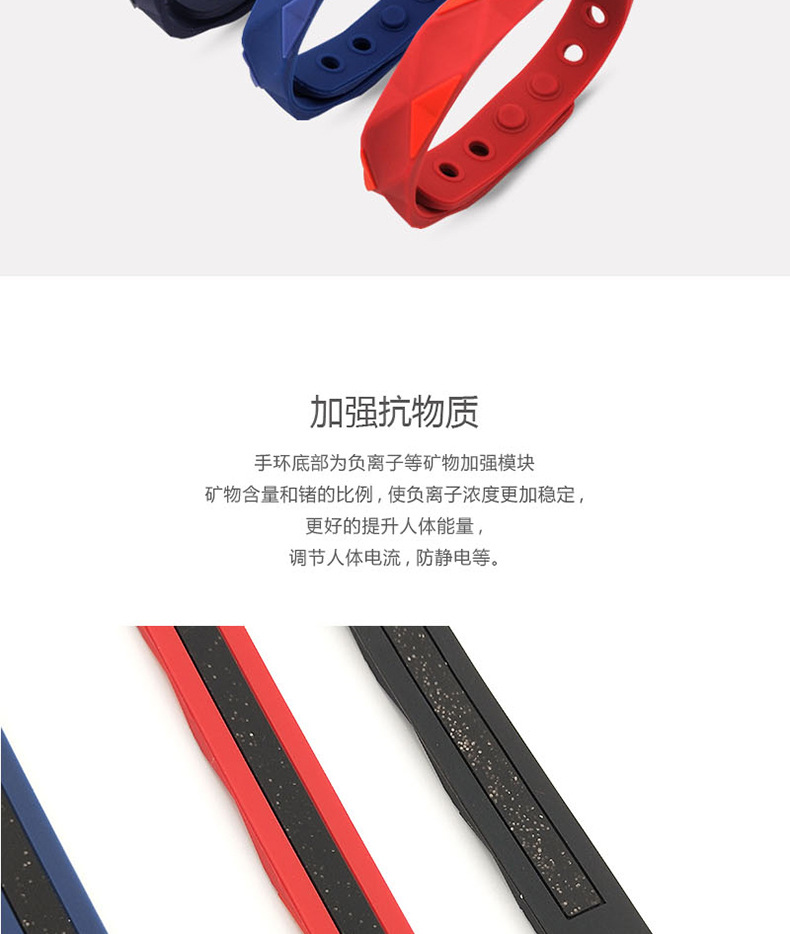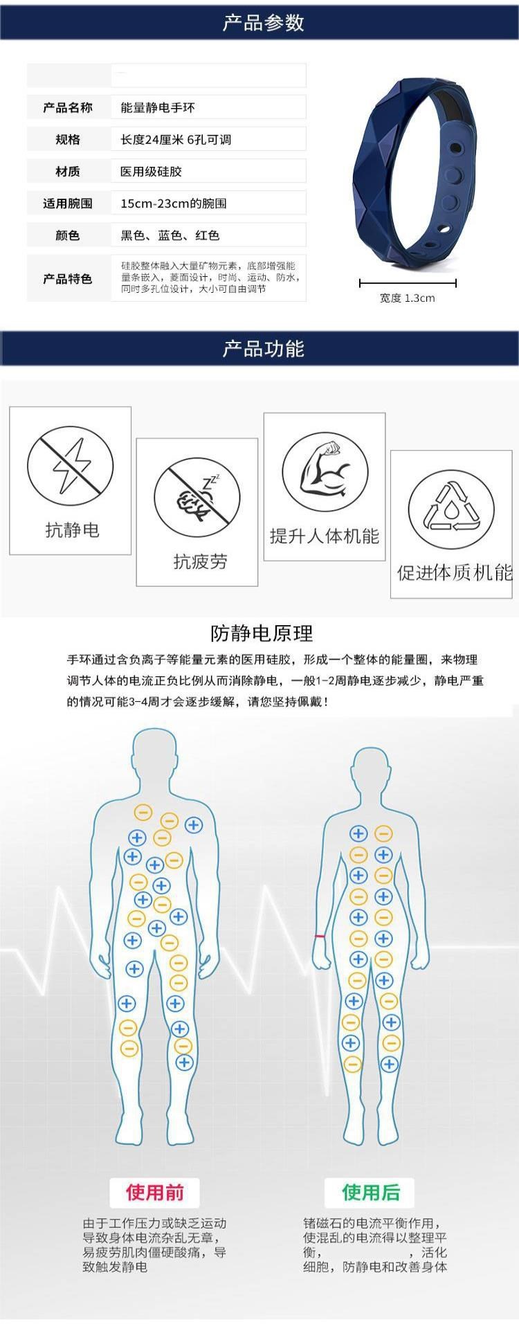 ▸由於工作壓力或缺乏運動,身體電流雜亂無章,易疲勞及肌肉僵硬酸痛,導致觸發靜電。手環通過含負離子等能量元素的醫用硅膠,形成一個能量圈,物理調節人體的電流正負比例,從而消除靜電,改善體質機能。一般1-2周靜電逐漸減少,靜電嚴重的情況下3-4周會逐步緩解。獨特菱面設計,更具有質感和立體感;手環底部為負離子等礦物加強模塊,濃度更加穩定,更好發揮作用。多孔位設計,長度可自由調節,合適所有人群。