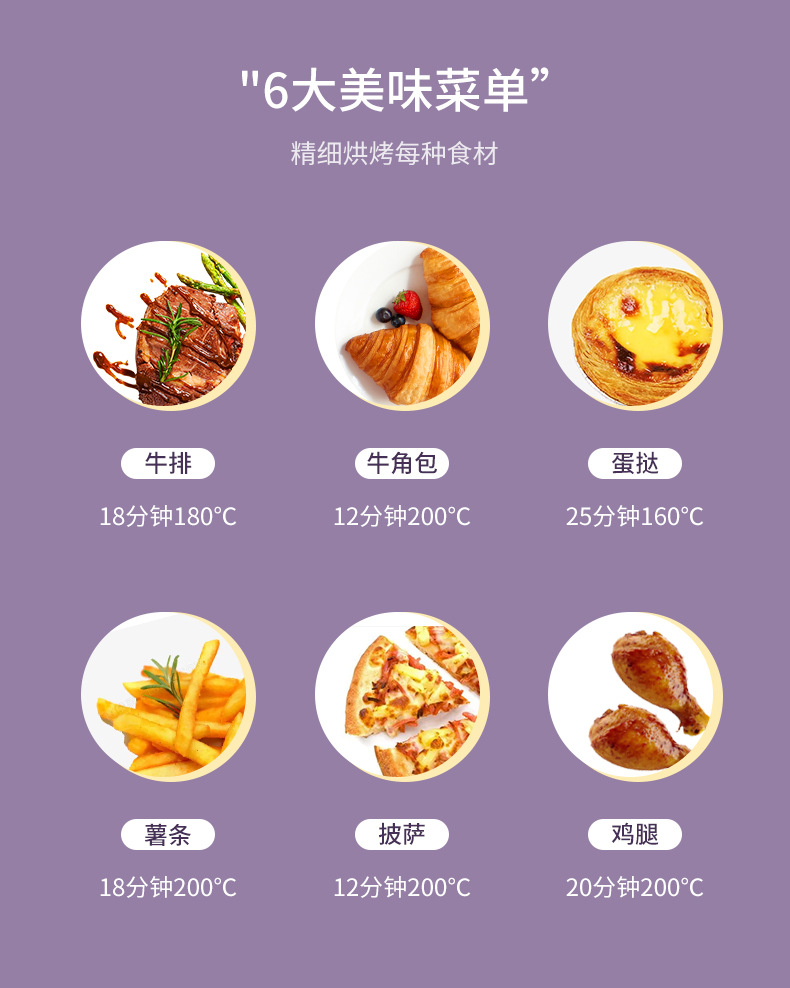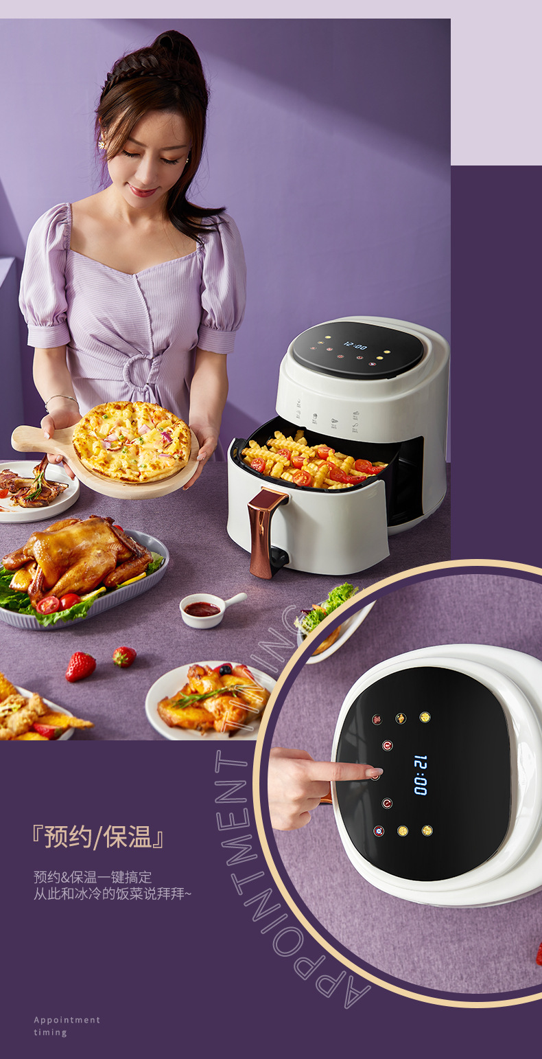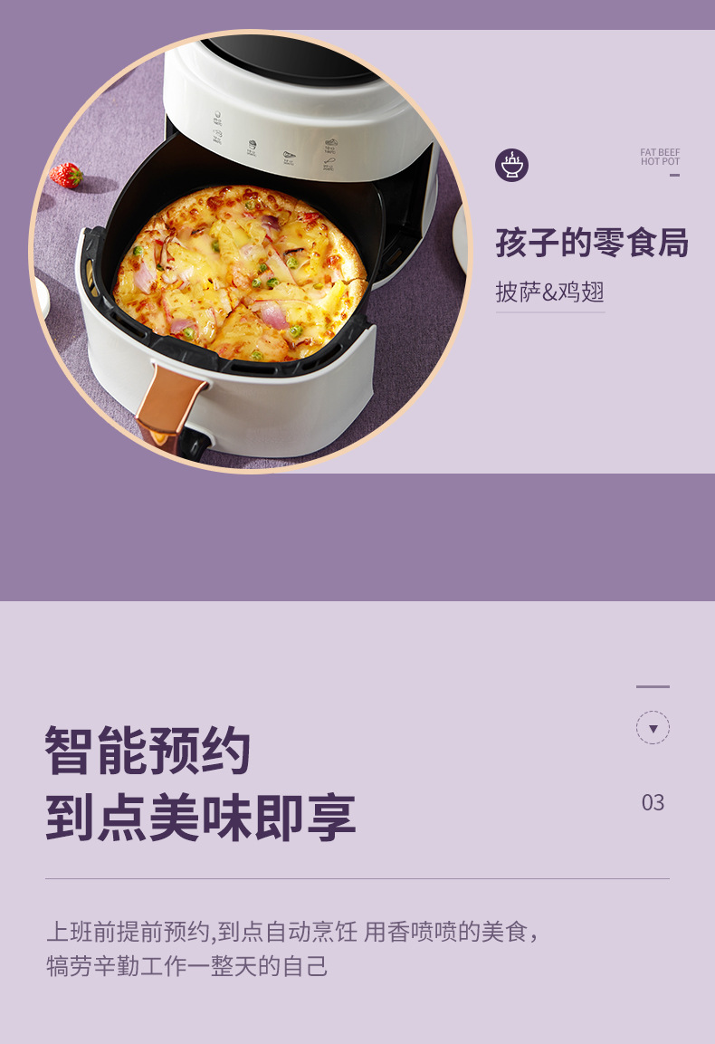 ▸四大懶人式預設菜單:薯條、烤肉、果乾、披薩模式,預約和保溫輔助功能。